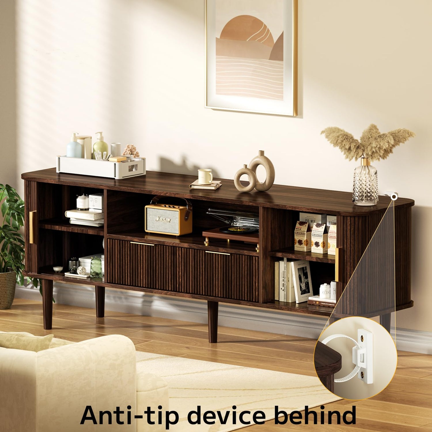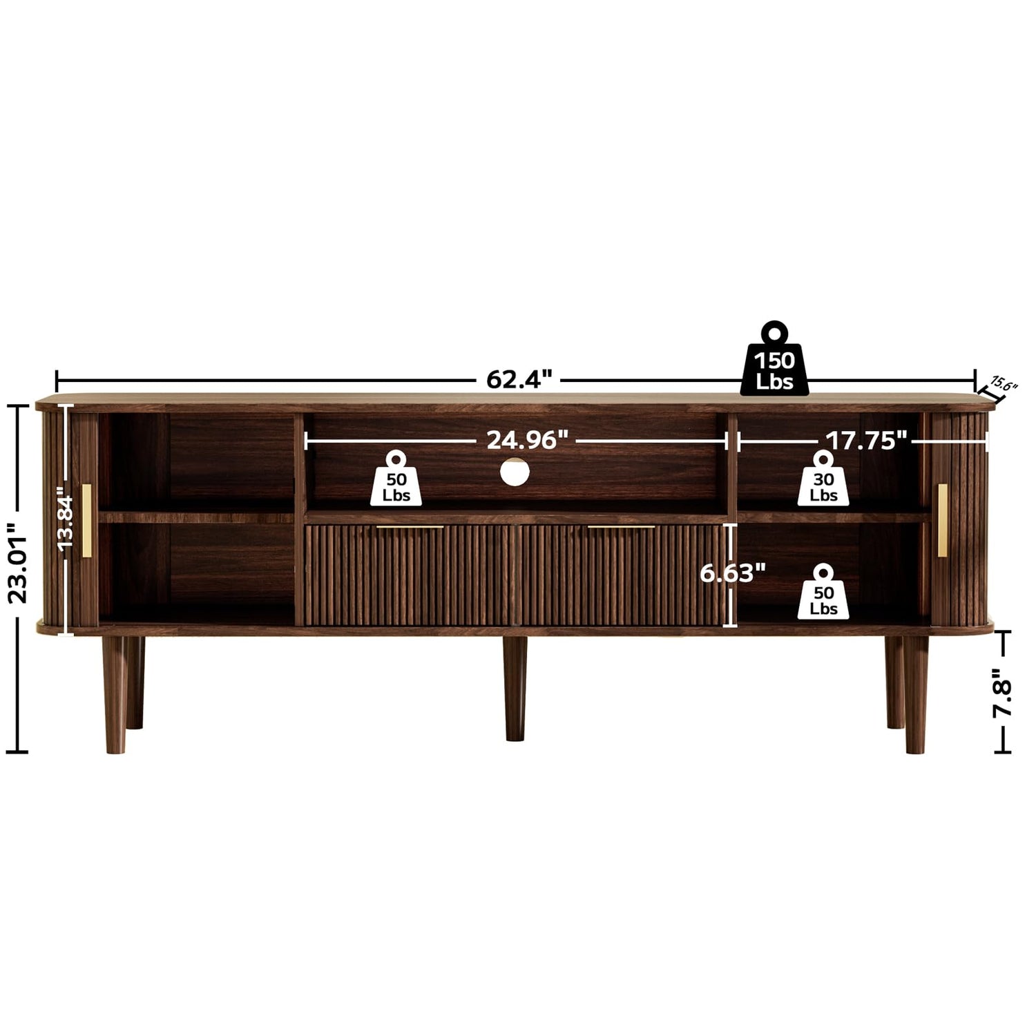 DAMCROP TV Stand 62.4 Inch Mid Century Modern Media Console Table with Drawer Shelves Sliding Tambour Door Farmhouse Sideboard Buffet Cabinet Fits TVs up to 75 inch Fluted Wood Entertainment Center