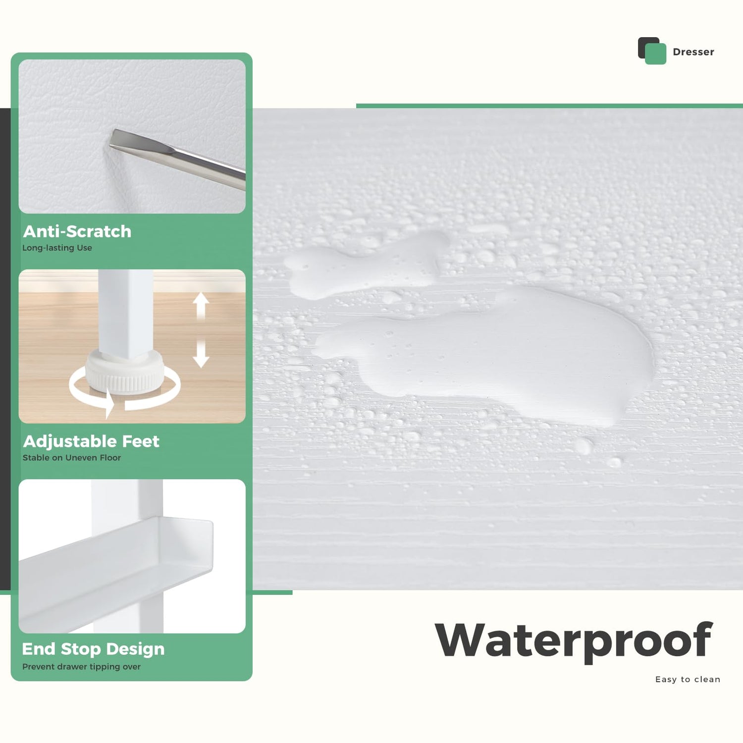 • Sturdy Frame & Feet: Built with a sturdy metal frame to ensure stability. Dumos dresser for nursery is equipped with 4 adjustable feet to safeguard your floor from scratches, and you can effortlessly balance the dresser in tight spaces. Moreover, this modern dresser comes with an anti-tilt device that can be utilized when mounting the dresser to the wall, preventing accidents caused by uneven floors or children climbing.