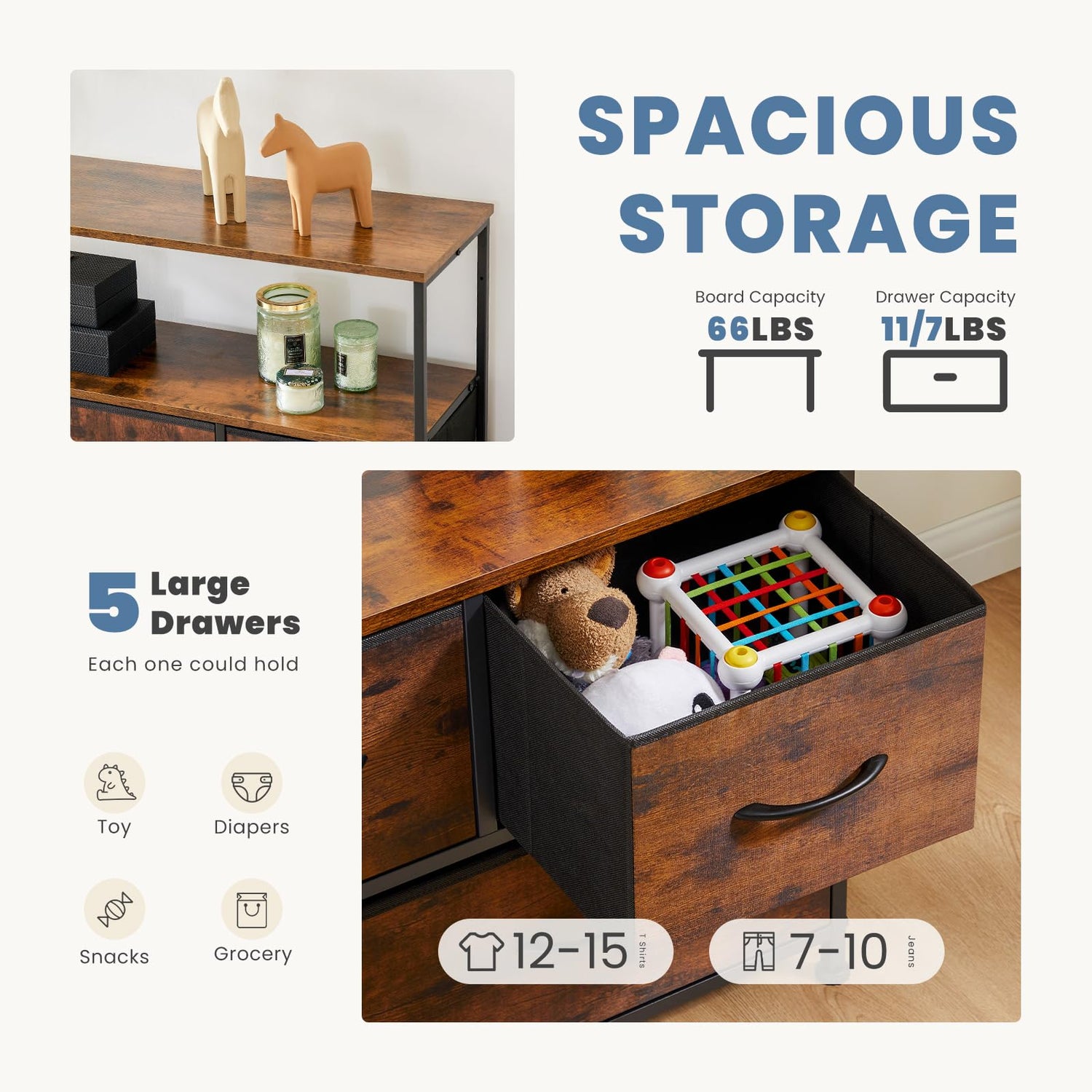 - 【Lightweight and Practical】The dresser features 5 fabric drawers and shelves, making it a lightweight and versatile addition to any bedroom or living room. The media console can serve as a space-saving alternative to a bulky TV stand, complement a TV console table, or function as an entertainment center in your home.