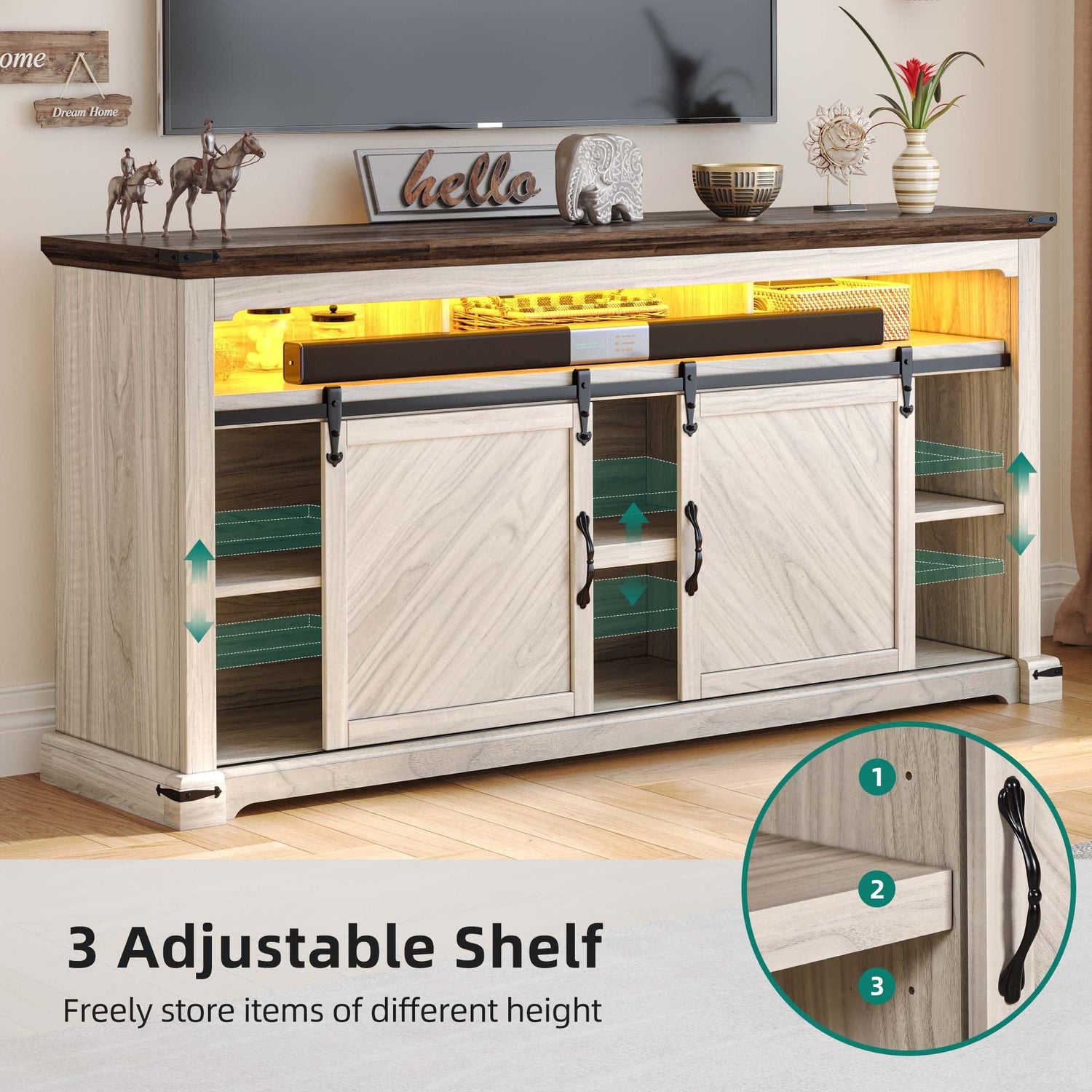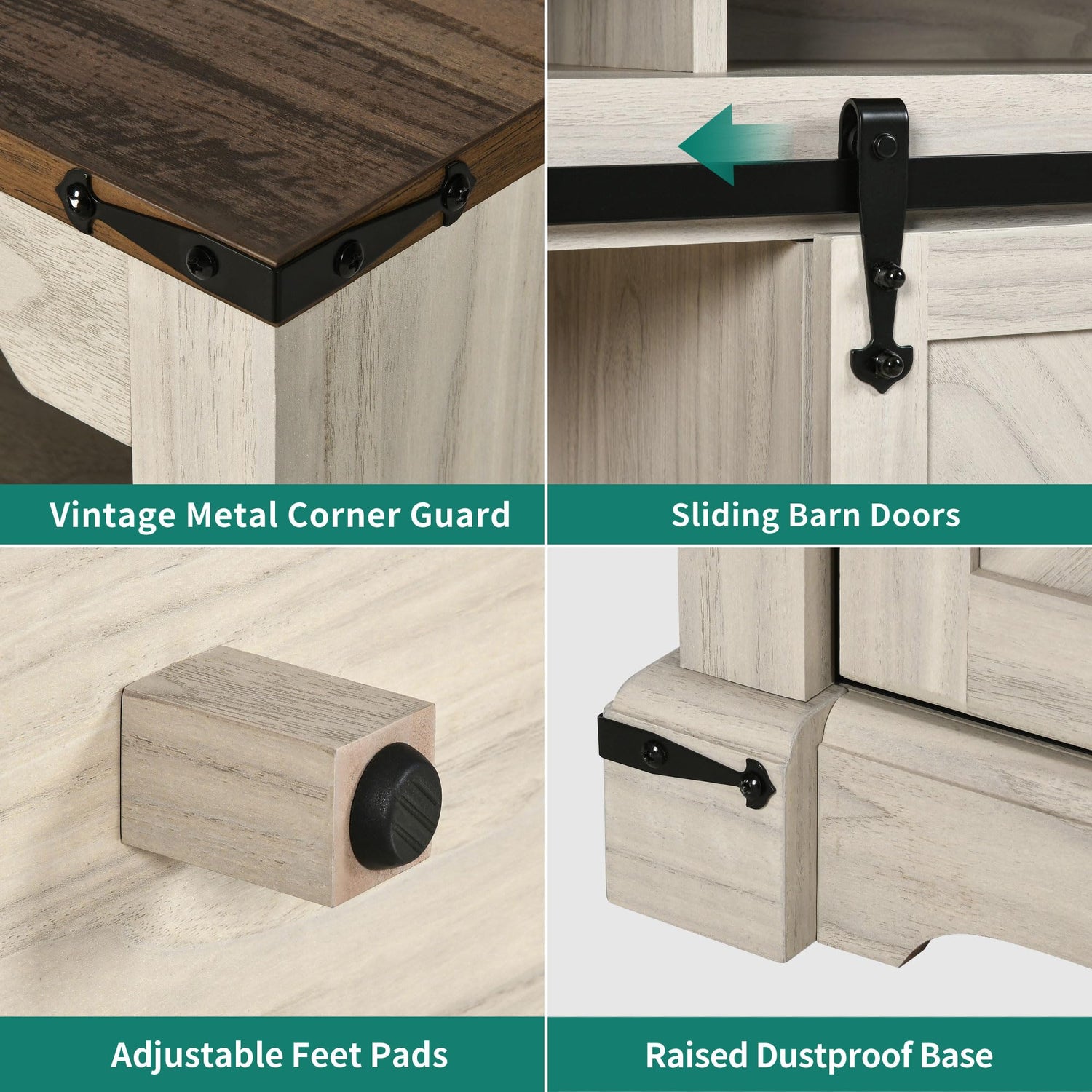 DWVO TV Stand for 75 Inch TV with Power Outlets, LED TV Stands Farmhouse Entertainment Center TV Media Console with Sliding Barn Doors for Living Room, Off White & Walnut Grain, Leaf TV Table