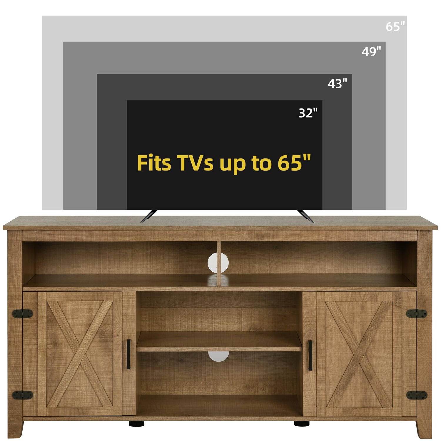 - TV Stand with Storage: This tv stands for living room come with 2 cabinets of storage space inside the barn doors, 1 adjustable or removable shelf, 1 open storage shelf, and one 59 inch large spacious desktop. It providing abundant storage or display space for CDs, DVDs, game boxes, decorative items and more. The spacious tabletop supports 40, 45, 50, 55, 60, or 65 inch TV