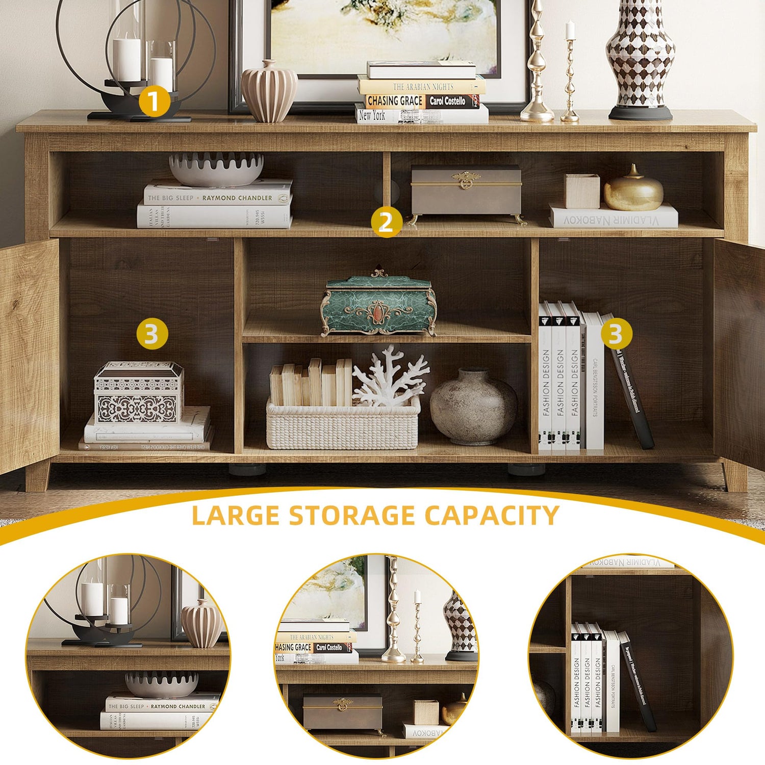 - Multifunctional TV stand: The TV stand support flat screen TVs up to 65 inch, compatible with most sizes of TV cabinets, such as 65/60/55/50 inches. If you like, it can also serve as a storage cabinet to show your family photos and artworks. can also serve as a buffet cabinet to Keep your kitchen utensils neat and orderly
