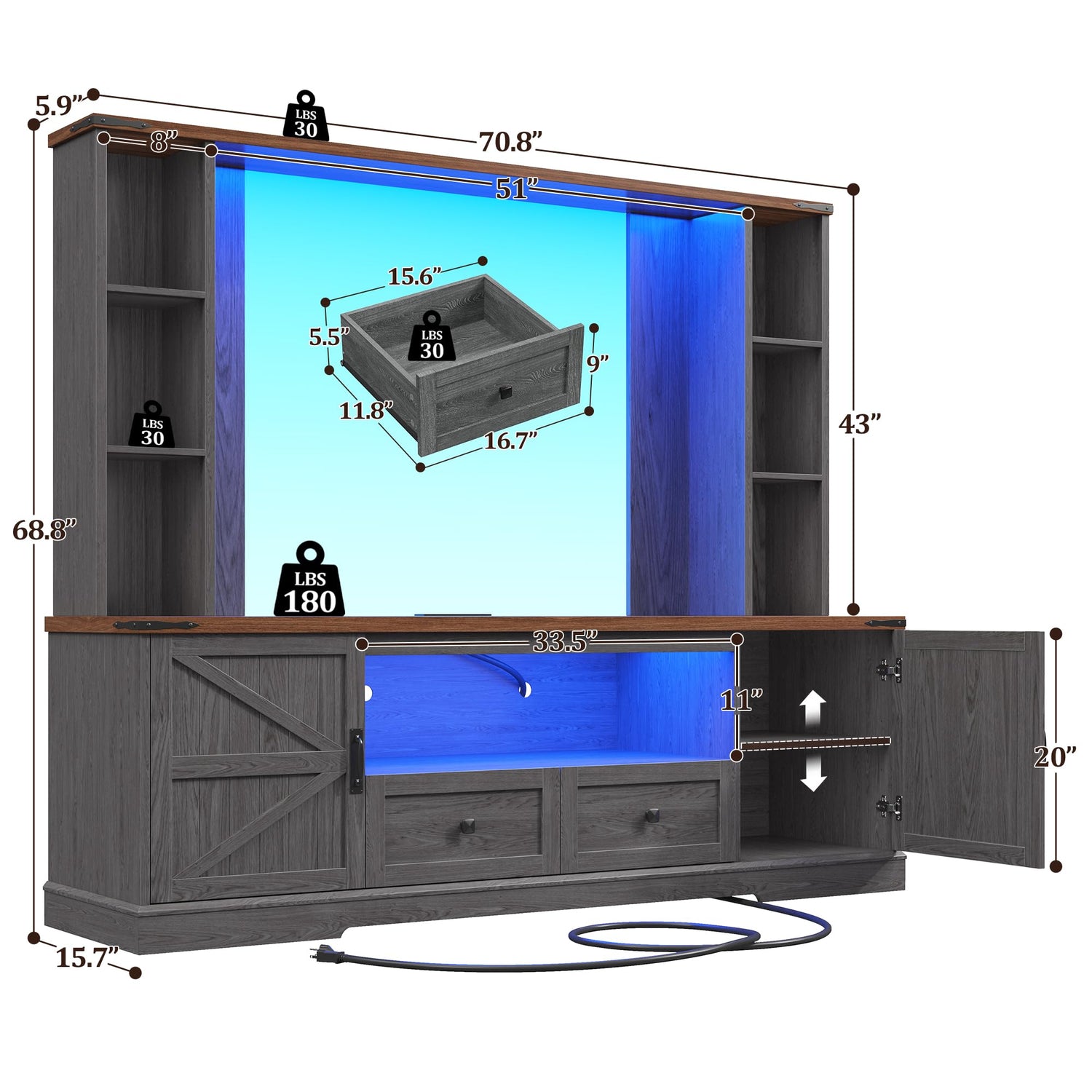 Entertainment Center with 2 LED Lights & Power Outlets, Large Farmhouse Wall Unit Entertainment Center for 60 Inch Television Stand, TV Stands for Living Room with Storage Shelf, Dark Grey