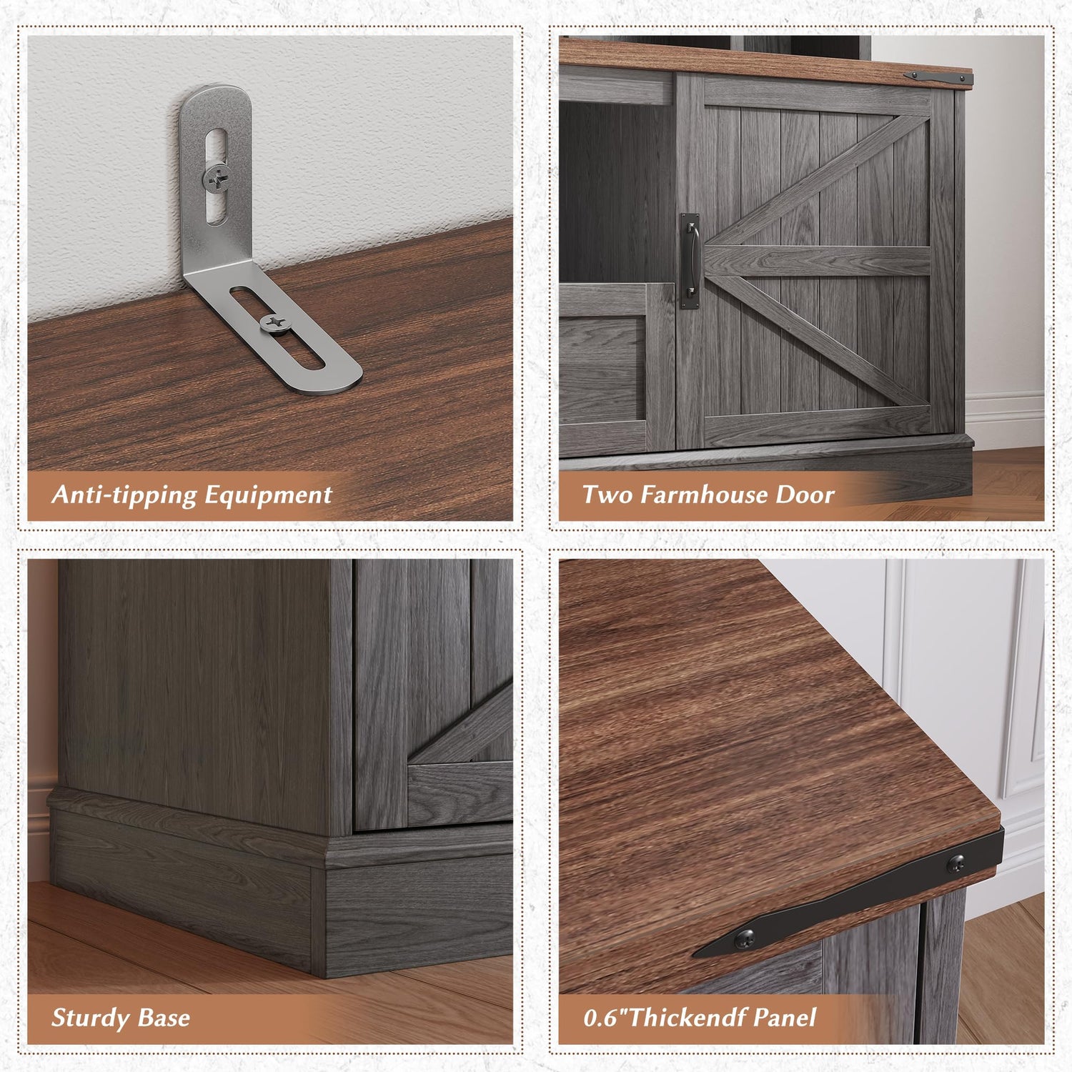 - 【Extensive Storage Space】This TV console perfectly combines modern, and rustic farmhouse style. This farmhouse TV stand includes a display cabinet, a bookshelf, a wine cabinet, two farmhouse doors, 2 large storage space and a 60 inch Wide TV console, is ideal for entertainment center with bookshelves, offering a practical and versatile solution for your space