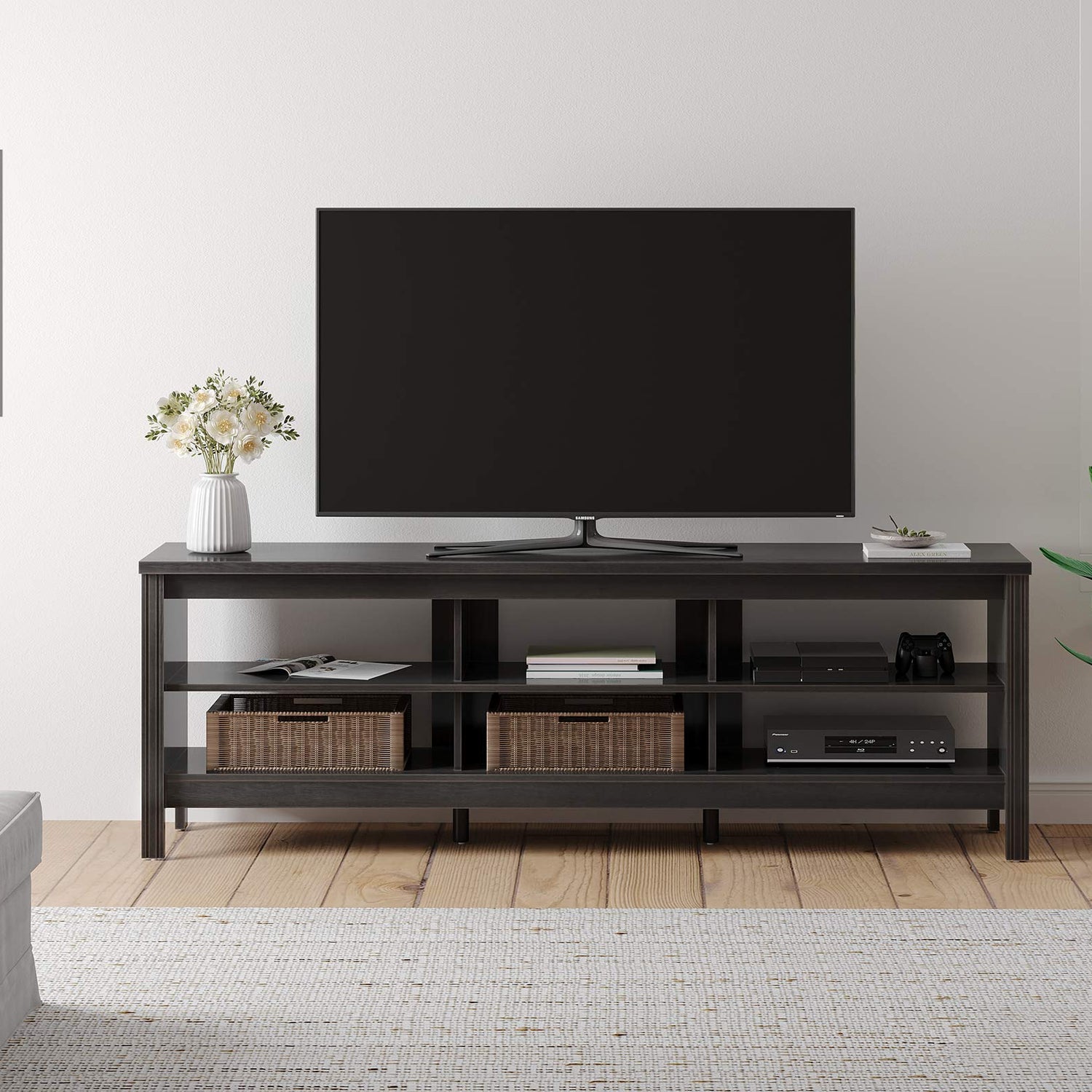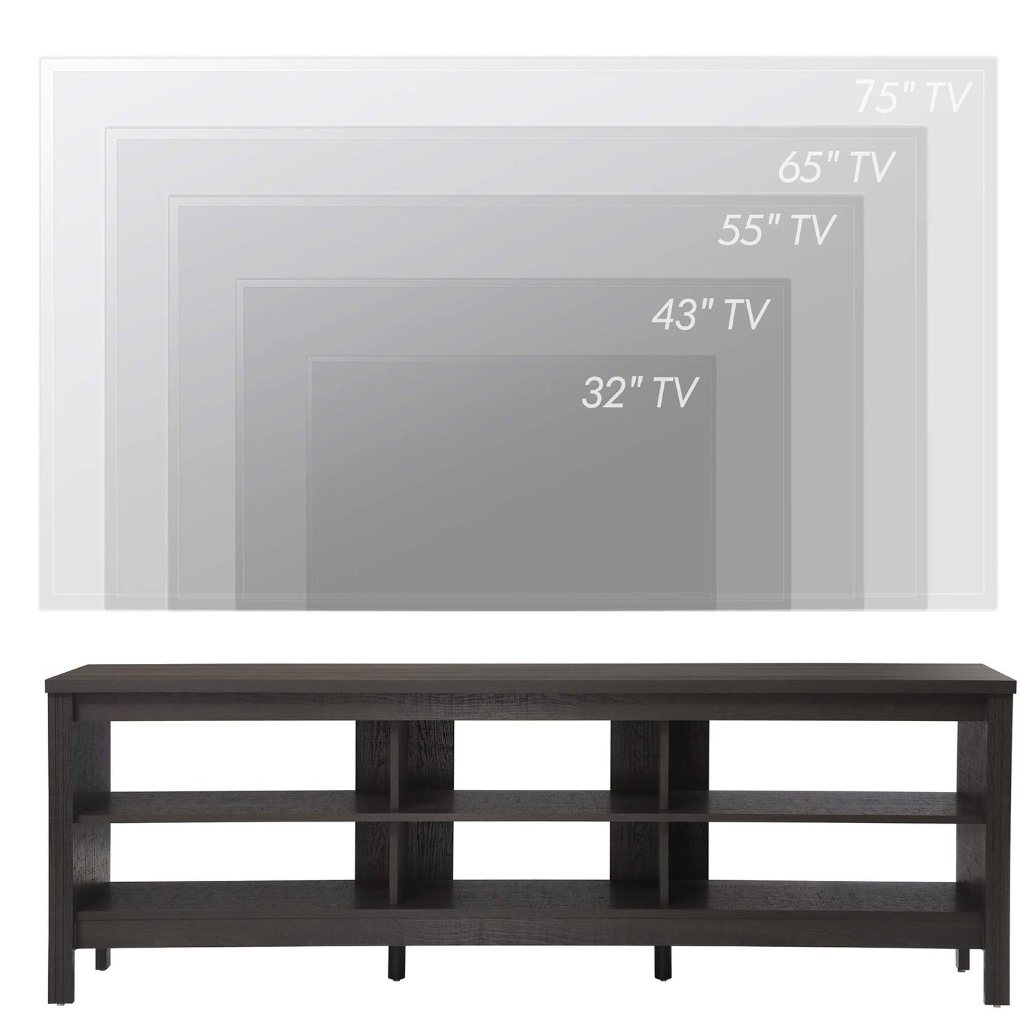 • 【Large Tabletop & Storage Space】Characterized by a wide tabletop, the television stands can accommodate TVs up to 75", of course, it is also suitable for 50", 55", 60", 65" flat screen. And the 70 inch TV stand features 6 cubby to offer sufficient storage space to meet all storage requirements. Plus, the open storage shelf design makes it easy to display and take your things.