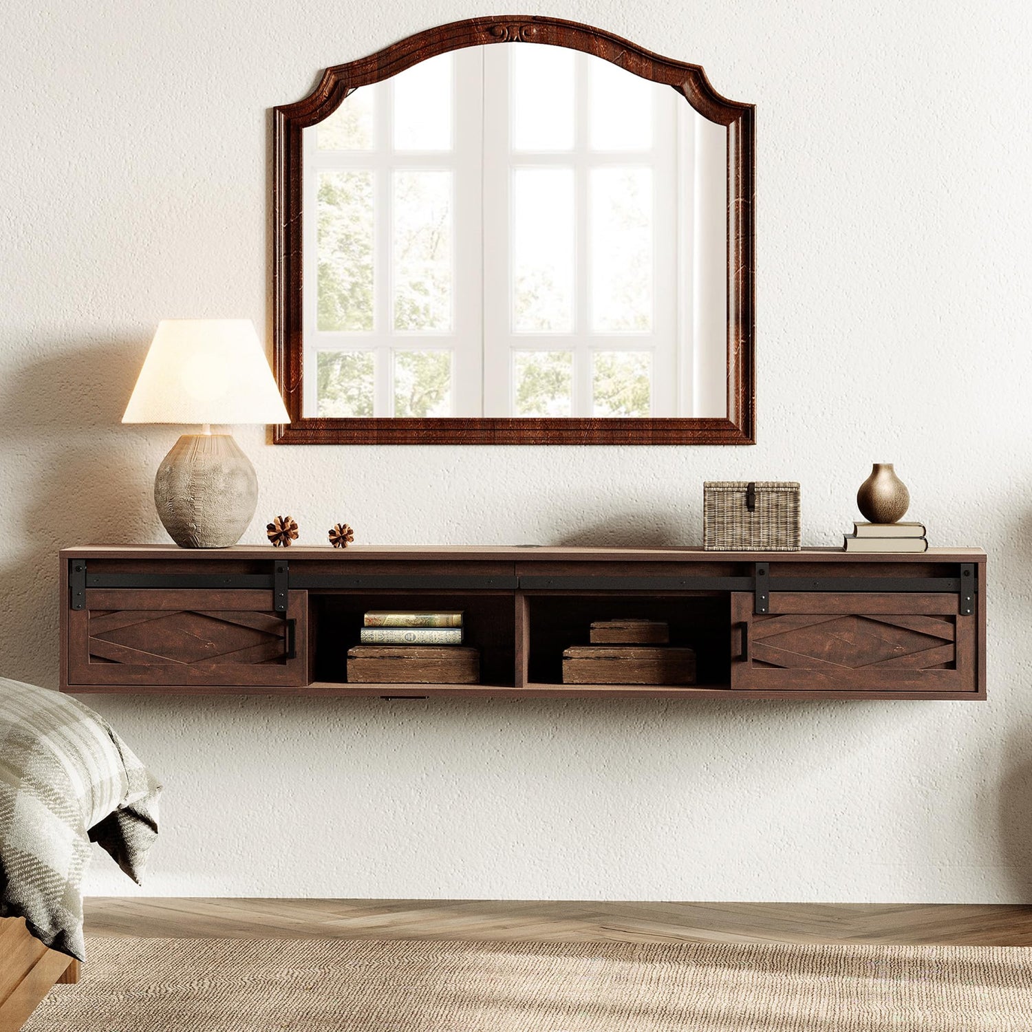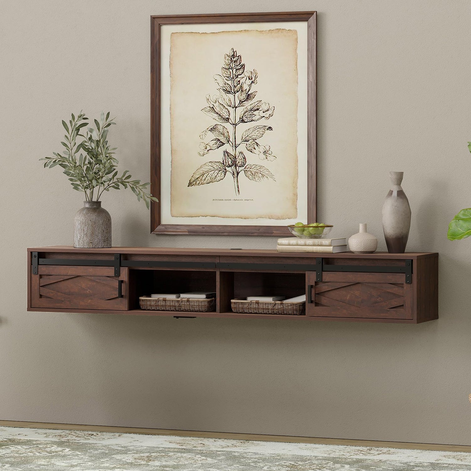 FITUEYES Floating TV Stand Shelf for TVs up to 85 Inch, Wood Floating Entertainment Center with Sliding Barn Door, Floating TV Shelf Media Console Table for Living Room, Bedroom, Rustic Brown