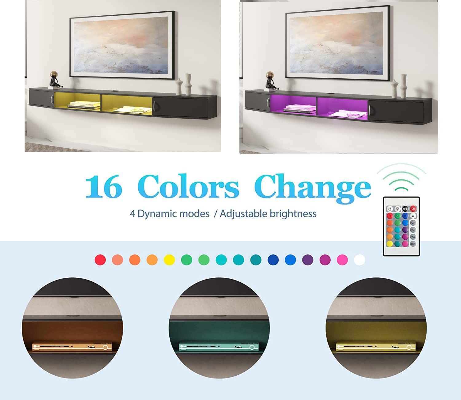 FITUEYES Floating TV Stand Wall Mounted Shelf with 16 LED Lights, Wood Media Console Entertainment Center Under TV, Cabinet Hutch Desk Storage for Home and Office,Black