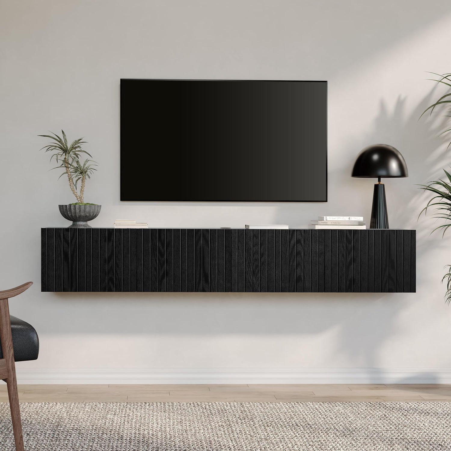 FITUEYES Large Floating TV Shelf Wood Media Entertainment Center,Wall Mounted Shelf with 3 Fluted Doors for TVs up to 80",Floating Storage Cabinet Under TV for Living Room, Bedroom,Black