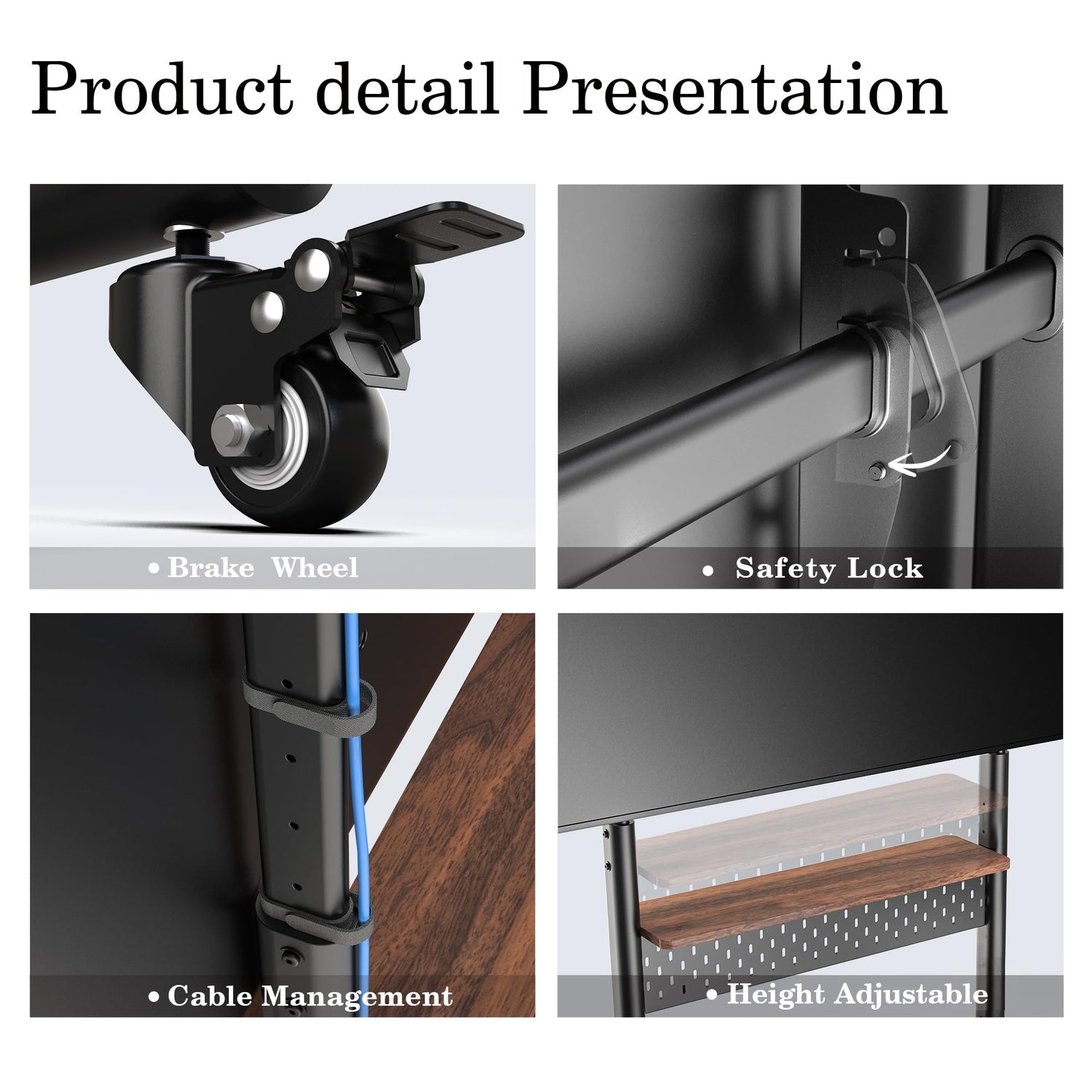 - Multifunctional Storage: The mobile TV stand on wheels is equipped with a multifunctional hole panel and storage shelf. You can hang a storage box on the hole panel to add more storage space, or you can hang gamepads and sticky notes on it