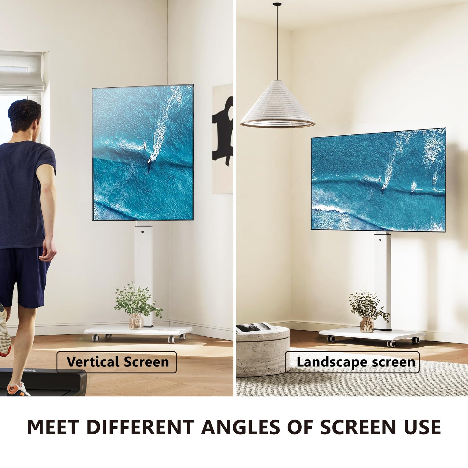 - LANDSCAPE TO PORTAIT ROTATING - This mobile tv stand on wheels can hold your TV both horizontally and vertically and you can swivel the TV left or right by 40°, the TV cart rolling tv stand is height adjustable, so whether you are sitting on the sofa or standing in a different position in the room, you can find the most suitable viewing position, and the flexible screen provides you with the best possible viewing effect