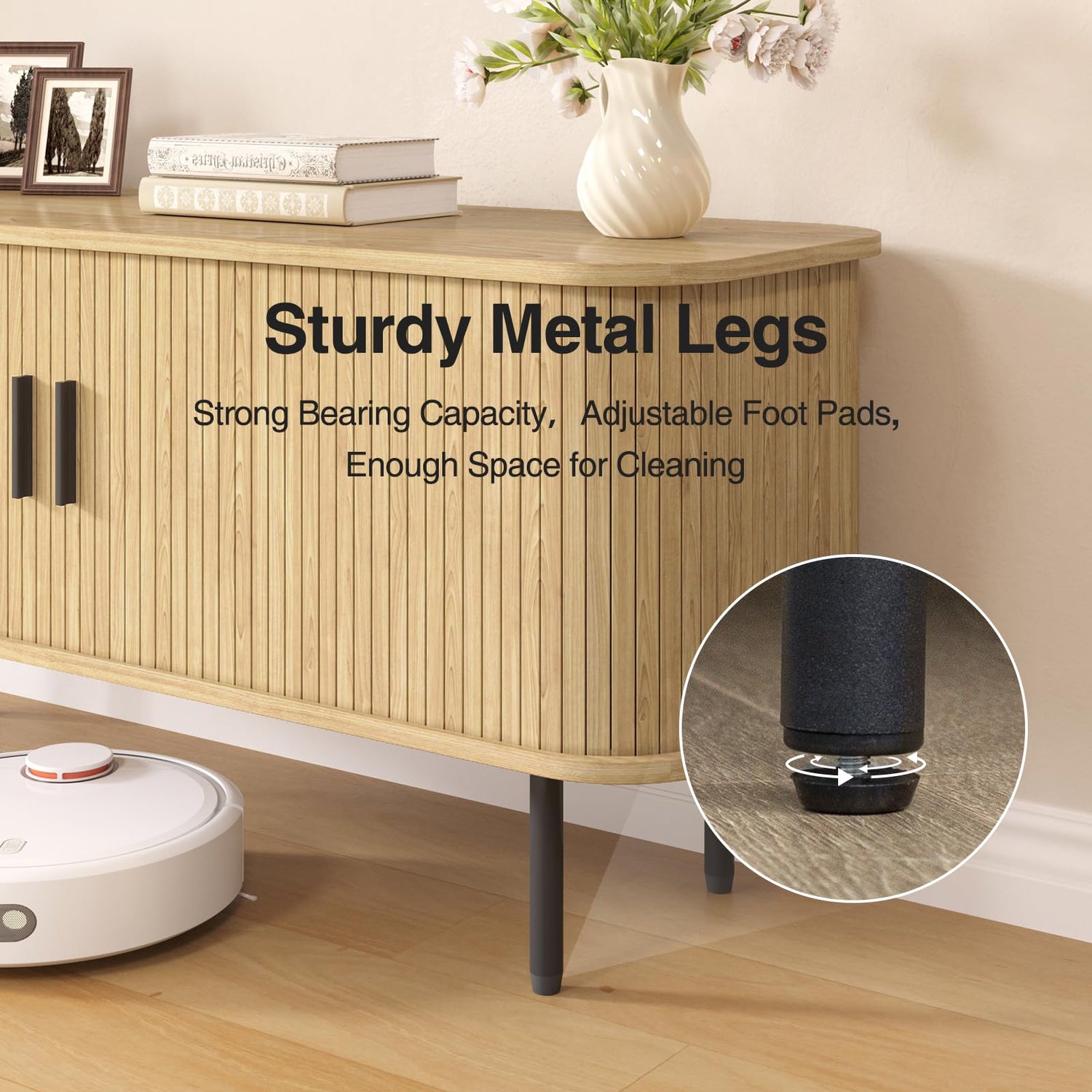 - Sturdy Material: The TV cabinet is made of engineered panel material. Sliding doors and metal handles are combined to incorporate natural tones that reflect modern and medieval charm. Multiple metal legs provide greater stability and robustness, while each leg is equipped with adjustable foot pads to accommodate uneven ground