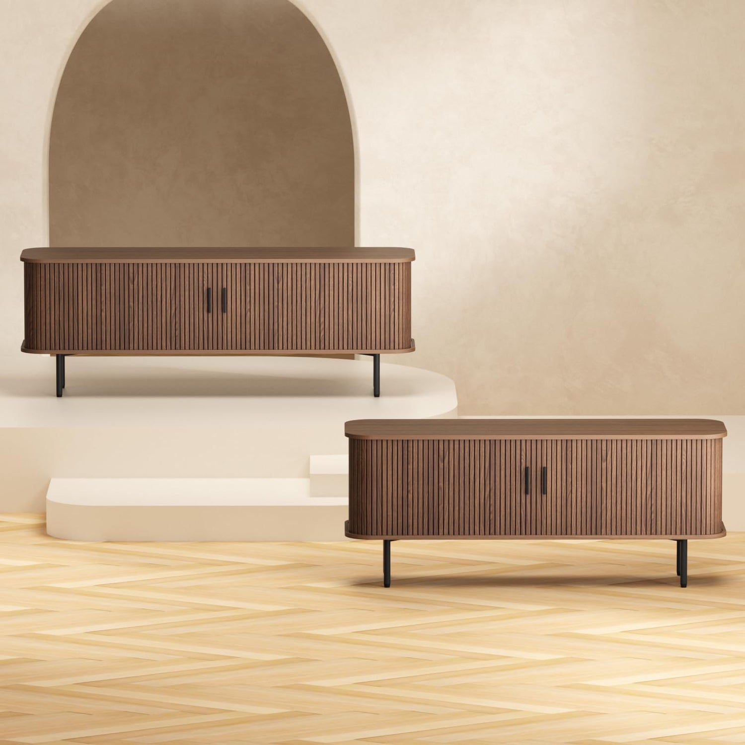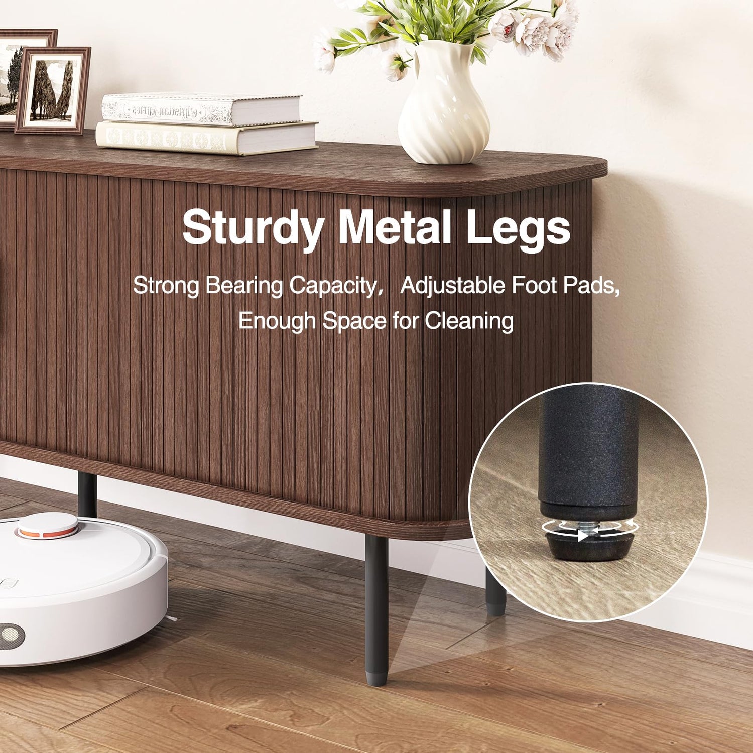 - Sturdy Material: The TV cabinet is made of engineered panel material. Sliding doors and metal handles are combined to incorporate natural tones that reflect modern and medieval charm. Multiple metal legs provide greater stability and robustness, while each leg is equipped with adjustable foot pads to accommodate uneven ground