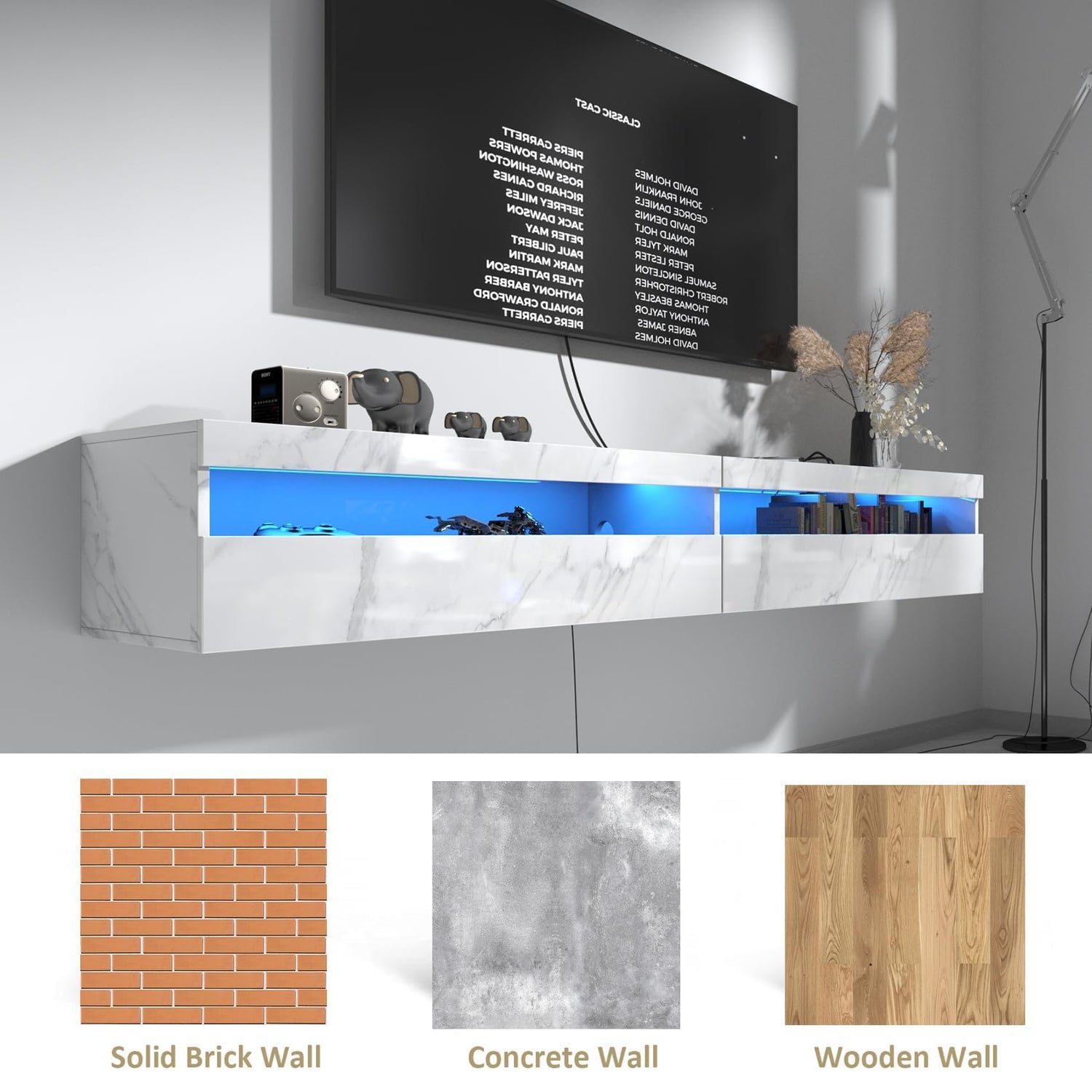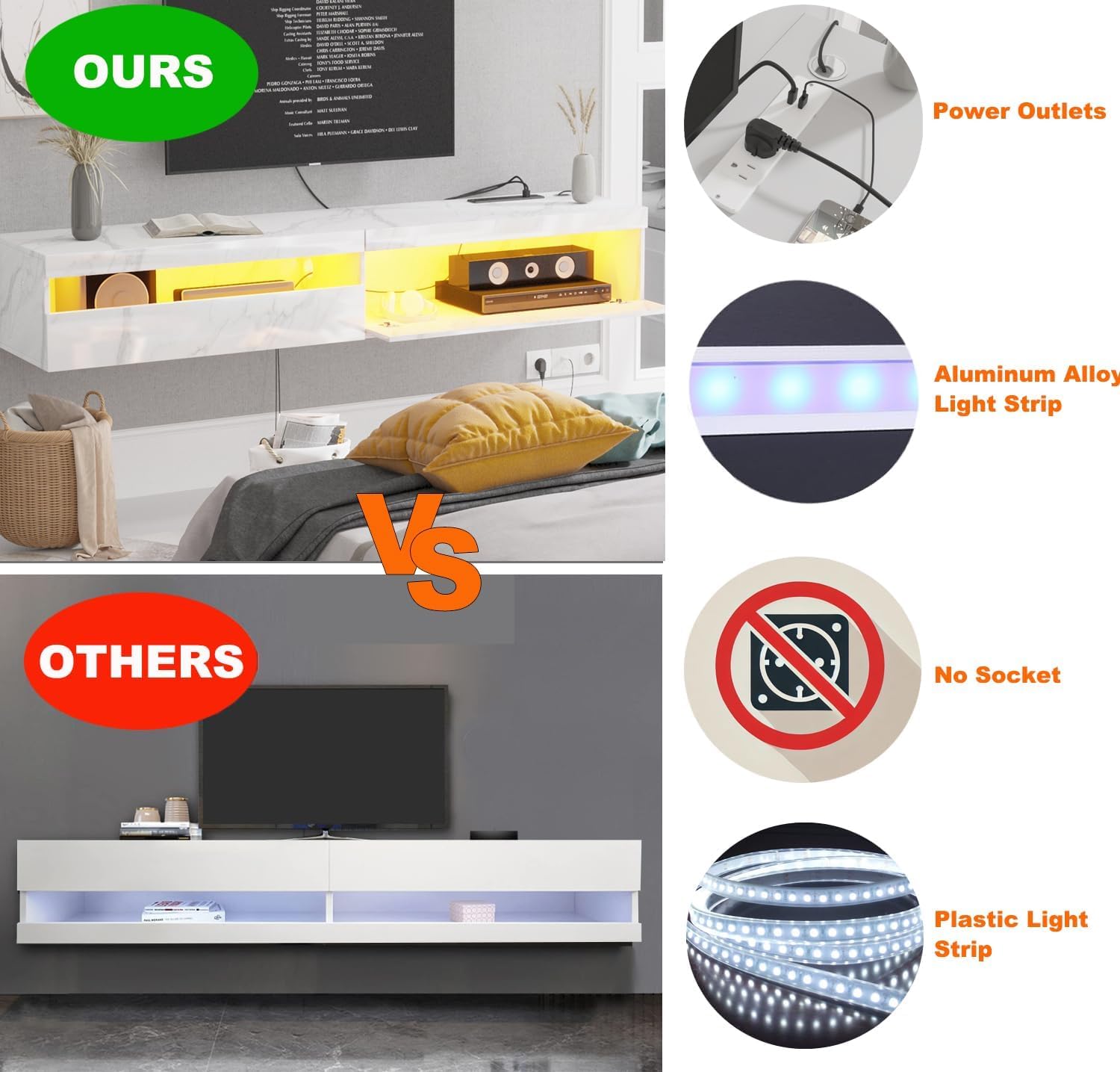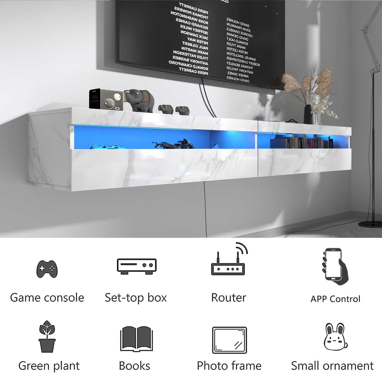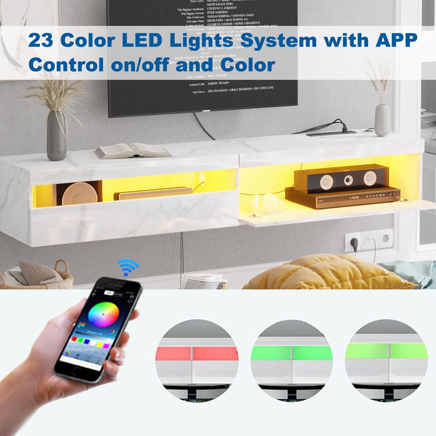 Floating TV Stand Wall Mounted with Power Outlet, Modern Floating Entertainment Center for 80 Inch TV, High Gloss Floating TV Shelf with LED Lights for Living Room, Bedroom, Marble White