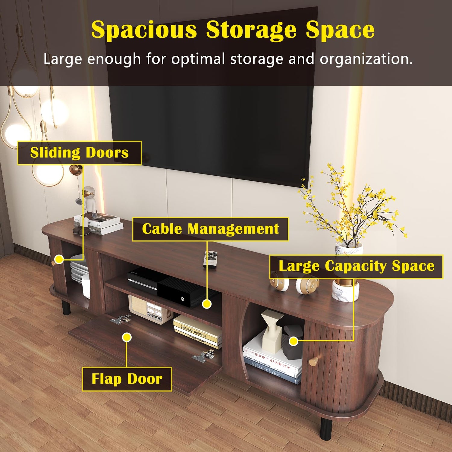 - 【Strong Load-Bearing Capacity】This grooved wood TV stand is made of high-quality materials with adjustable metal legs and metal handles. The design of 6 metal legs enhances the load-bearing capacity of the sliding door TV stand, making it more stable. All supporting legs are adjustable to keep the TV cabinet stable on uneven ground.