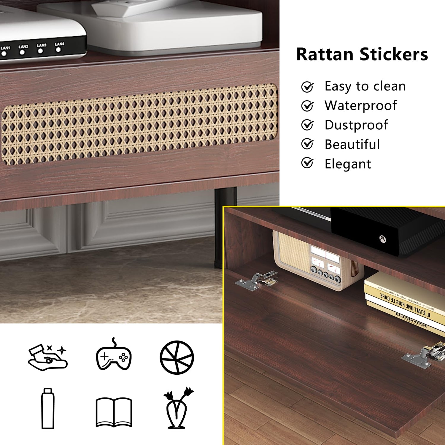 - 【Flexible and Ample Storage Space】This TV console table comes with 2 large storage cabinets, 1 flap door with rattan pattern sticker, and a spacious desktop, allowing you to store easily. You can hide some small items in the flap door and put the most commonly used CDs, DVDs, video games and other accessories in the storage cabinet. 1 cable management hole is located on the back of the TV cabinet. It is convenient for you to pass through wires, etc.
