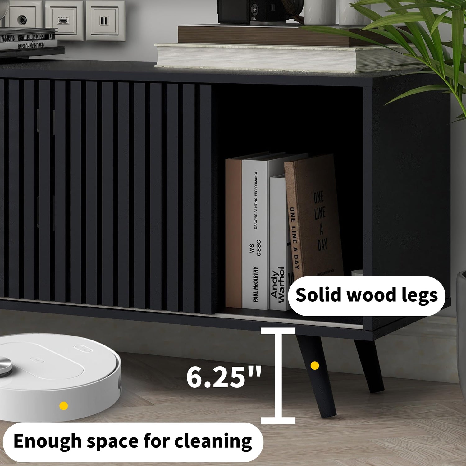 - 【QUALITY YOU CAN TRUST】Designed for stability and durability, this TV cabinet is made of high-grade particleboard material to ensure a long service life. The overall surface is very smooth and waterproof, no odor, no harm, and easier to clean. 5 wooden legs provide strong support and 6.25 inches of base-to-floor clearance makes cleaning easier. Overall dimensions: 15.75''D x 63''W x 22.7''H.