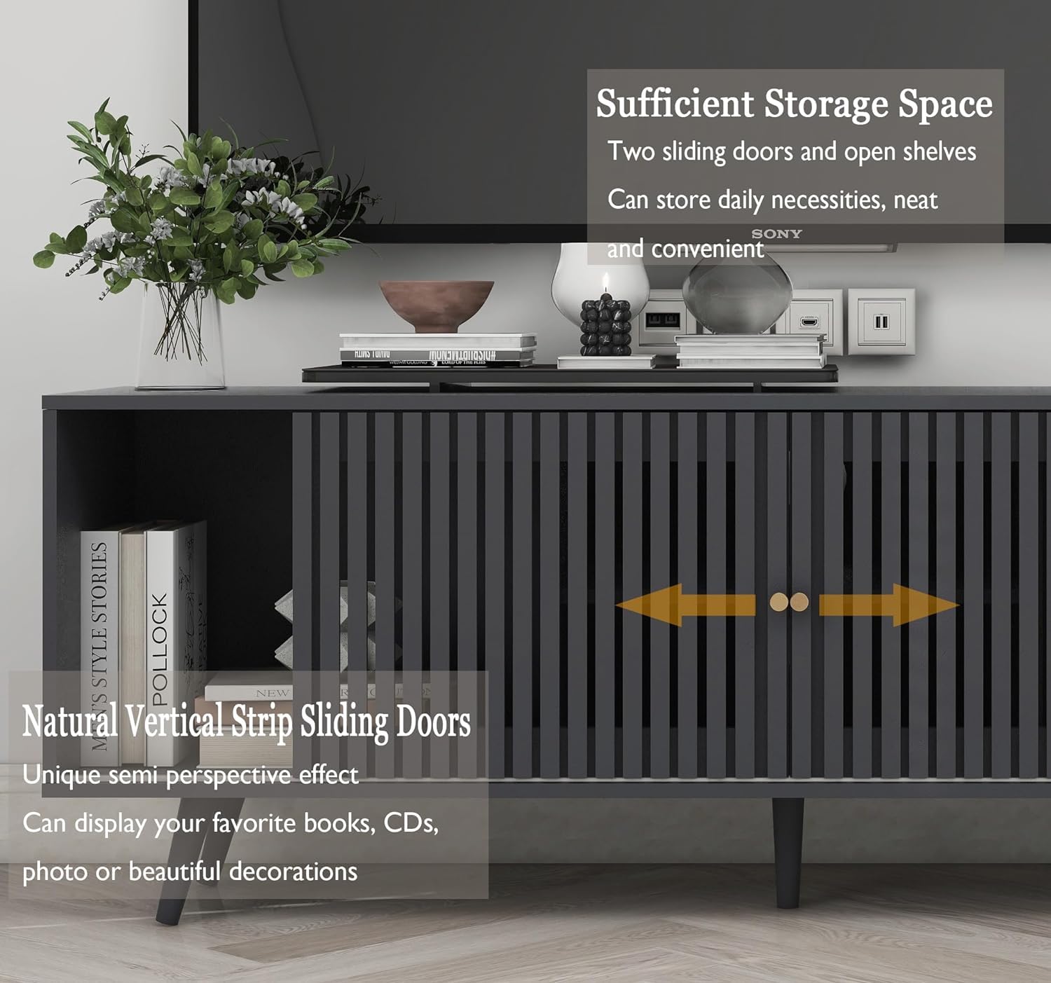 - 【EXTRA LARGE STORAGE SPACE】The mid-century modern TV cabinet features a spacious tabletop that can accommodate a 70/65/60/55-inch TV.The entertainment center features 2 sliding doors and open shelving, giving you plenty of room to store DVDs, remotes and other media accessories, decorative items and more. Keep your space tidy and organized with a visually appealing entertainment area and say goodbye to a cluttered living room!