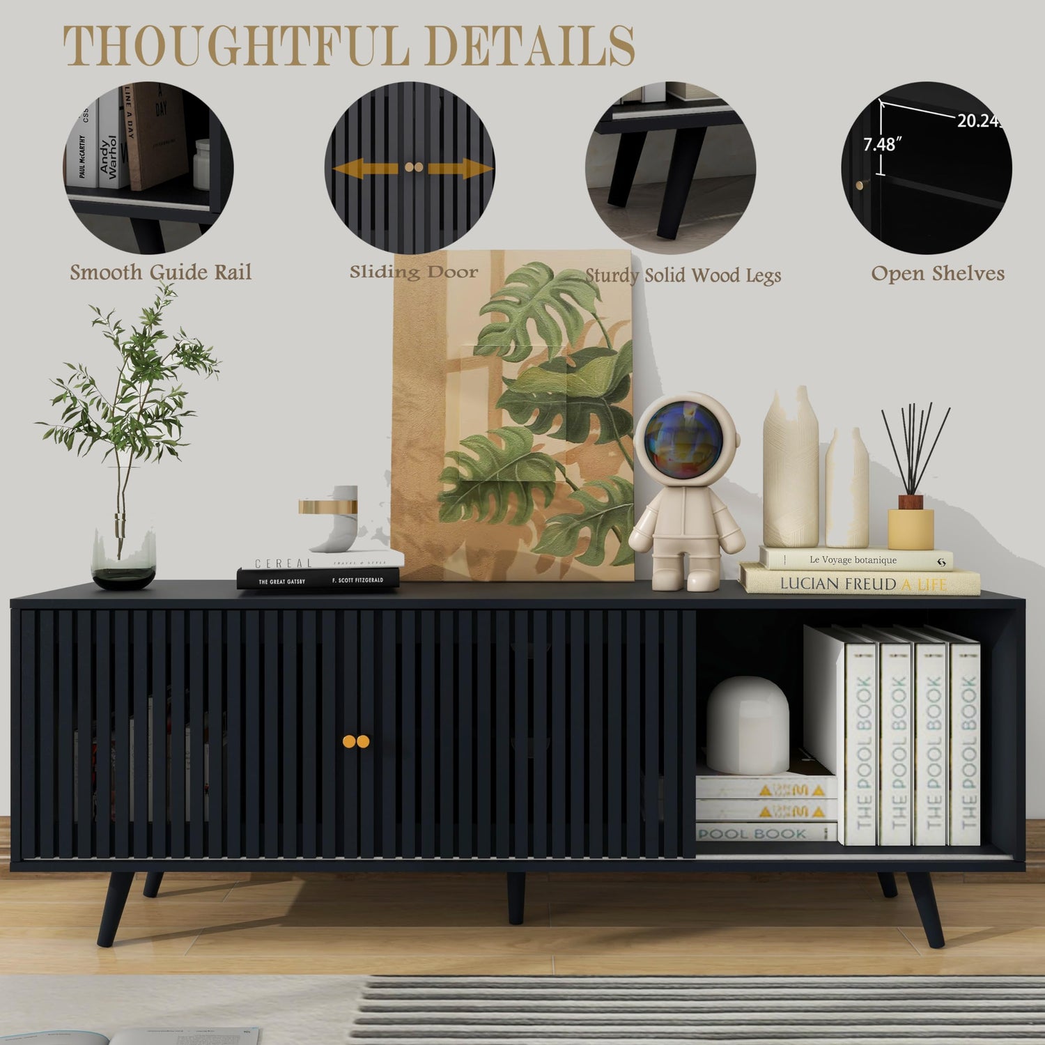 - 【MID CENTURY MODERN TV STAND】This TV stand features semi-perspective vertical bar sliding doors design, combined with classic colors, and every detail has been carefully designed. The simple lines of the long TV cabinet design can easily blend into various decorative aesthetics, providing a more beautiful environment for your entertainment experience, making it ideal for use in living rooms, bedrooms, and many other environments.