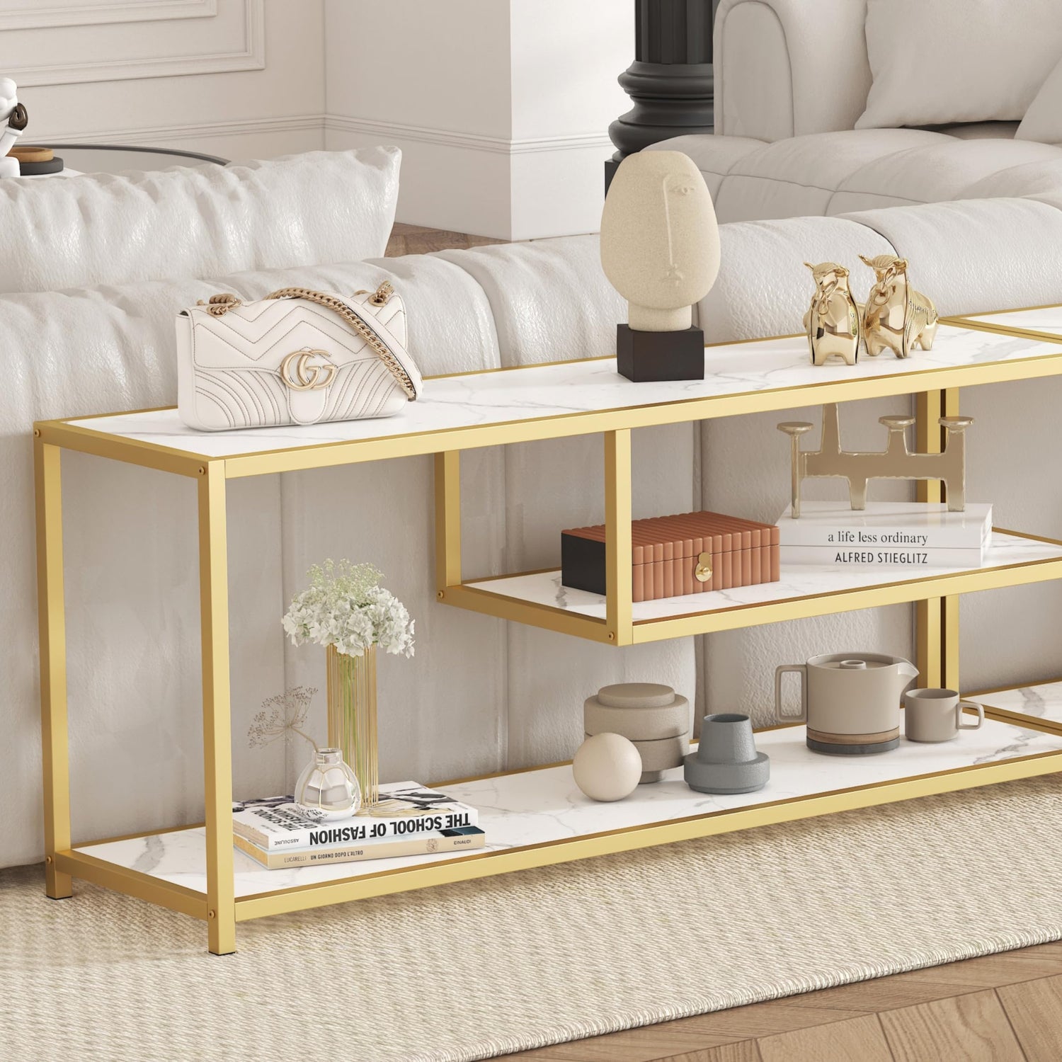 - 【Modern TV Stand】Constructed of gold metal frame and faux marble textured finished, 3 tier delicate shelves, the sleek glam look brings a charming complement to your home, without sacrificing functionality and practicality simultaneously.