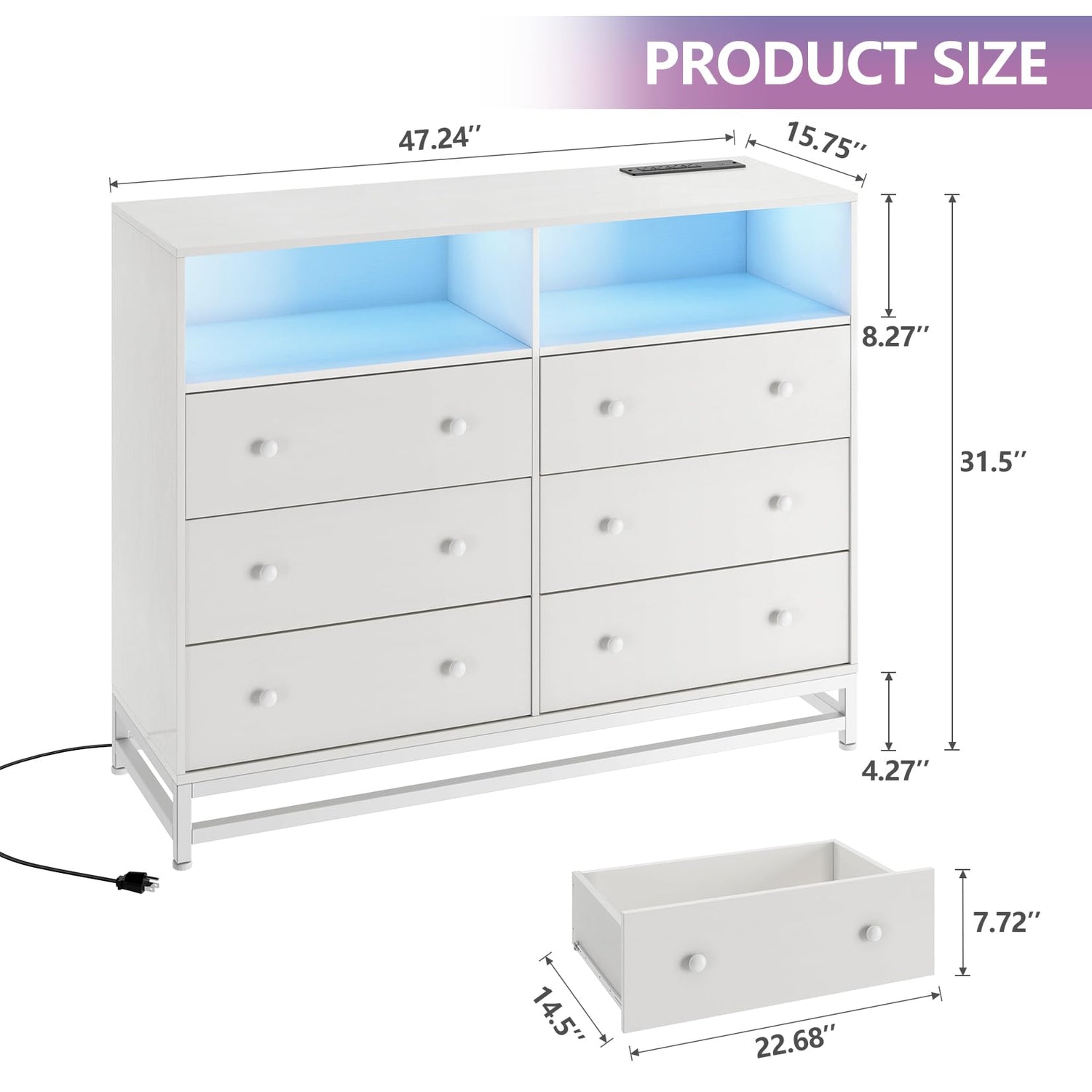 - LED Light Function: This dresser features multifunctional LED light strips with over 6000 colors to choose from, controllable via phone app or manual settings. Adjust brightness, color, mode, and timing to create your desired ambiance.