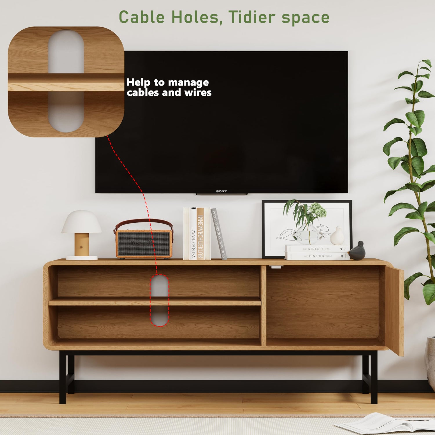 • Appearance and Design: This TV stand is made of high-quality wooden boards and has a sturdy and durable iron frame at the bottom. Drill holes on the back of the TV cabinet for better placement of wires, making the overall appearance more neat and tidy