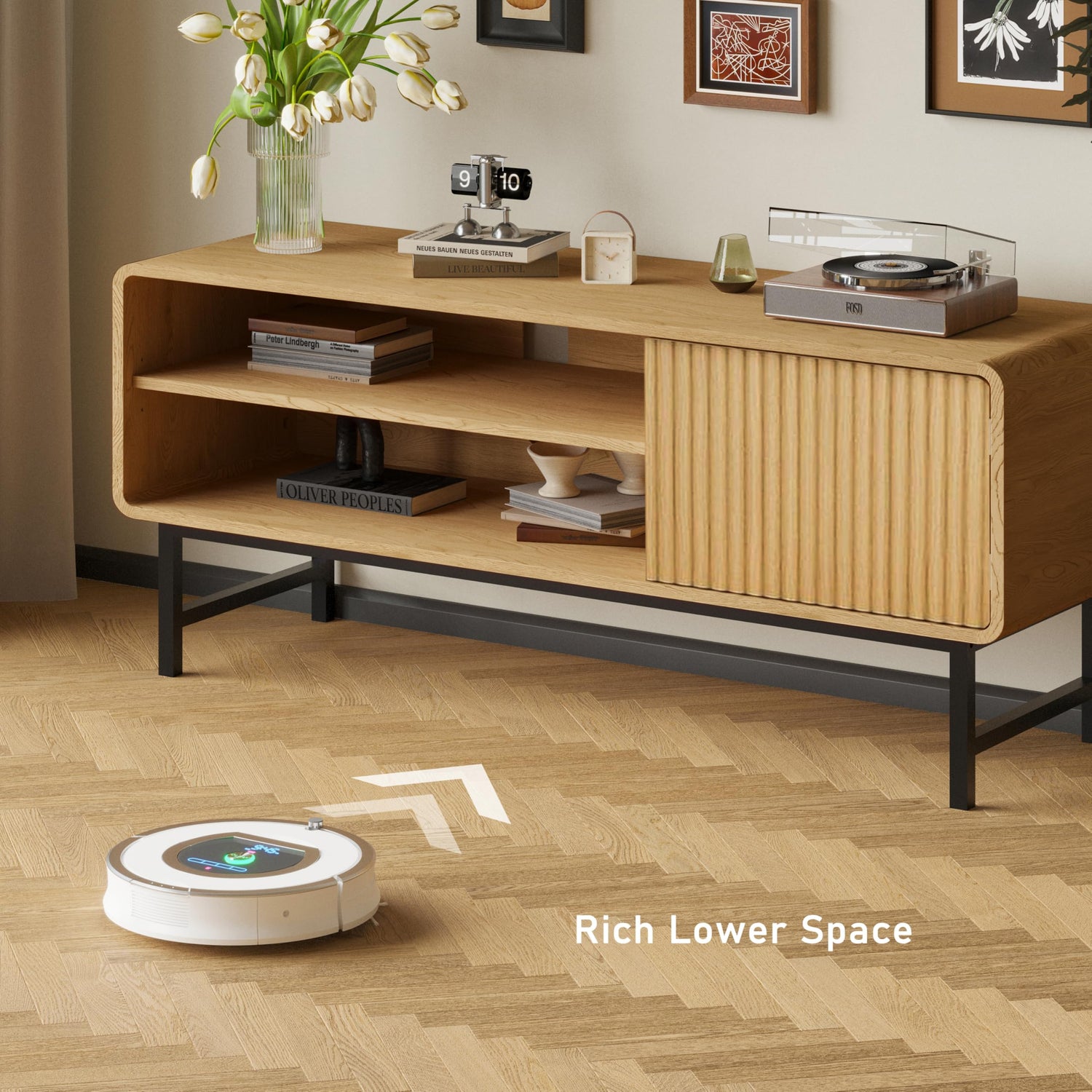 • Multiple storage spaces: Two open storage spaces provide ample storage space for media devices and supplies such as magazines, game consoles, and books. One storage compartment with a door can hold private personal items. The tripod design provides larger bottom storage space for items such as floor cleaning robots