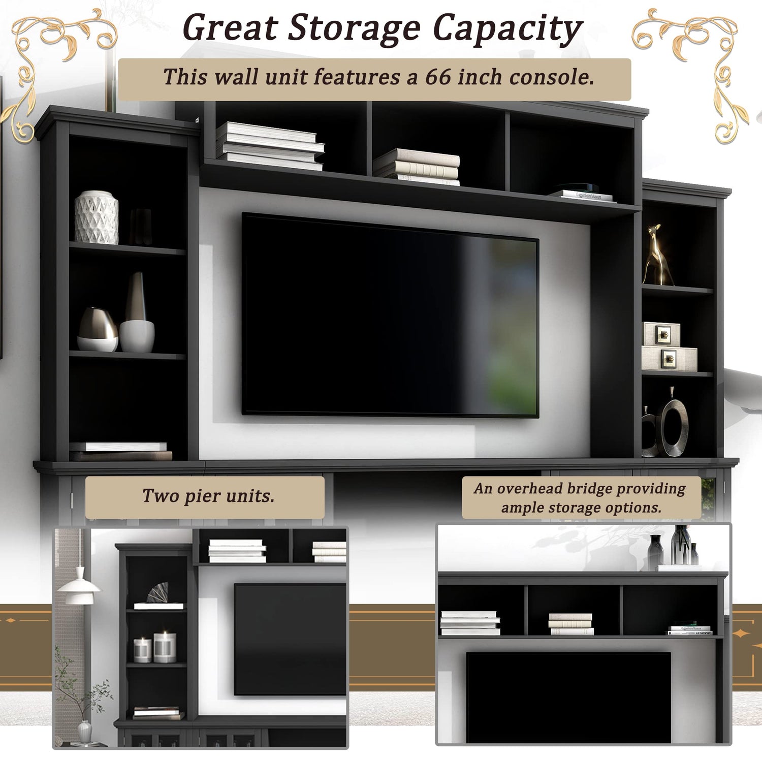 - This wall unit features a 66 inch console, two pier units and an overhead bridge providing ample storage options.