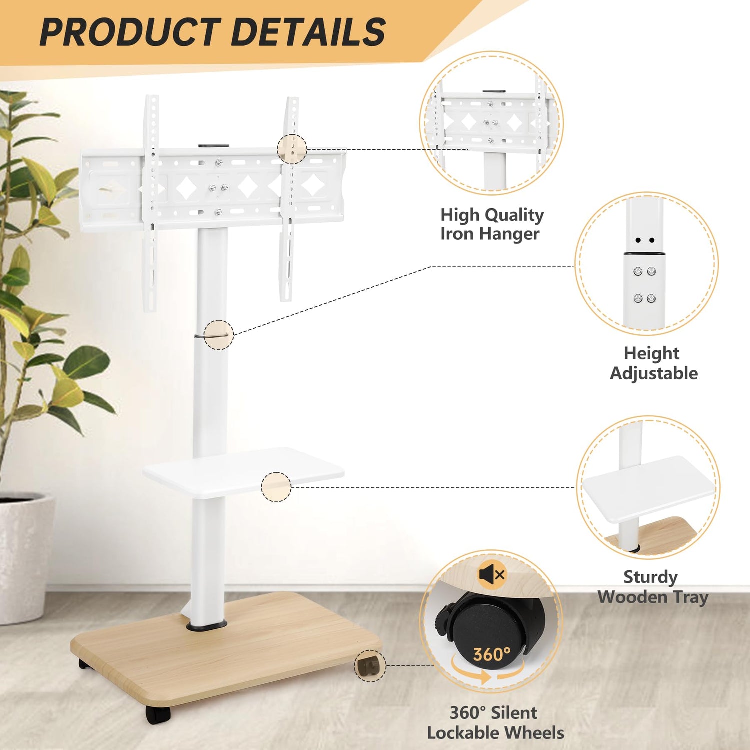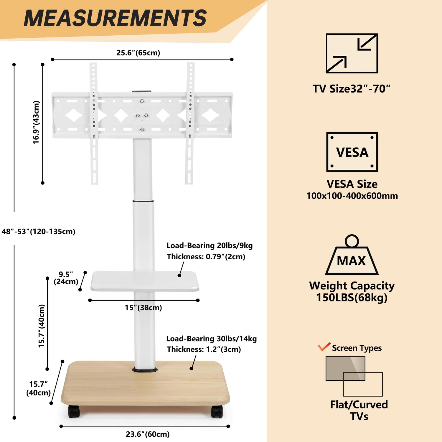 - 【Ultra Strong & Stable】- This portable mobile TV stand comes with a metal pillar and two pieces of wooden shelves which can total load capacity up to (150 pounds). The wooden textured base and tray, as well as the thickened metal bracket with a white paint finish, provide stability for this movable TV stand. The middle tray is supported by sturdy metal brackets, and holds up to (20 lbs). The thick rolling TV bracket is very strong and will not fall, plus the safety screw is an additional protection for the load-bearing capacity that can carry up to (100 pounds) of TVs