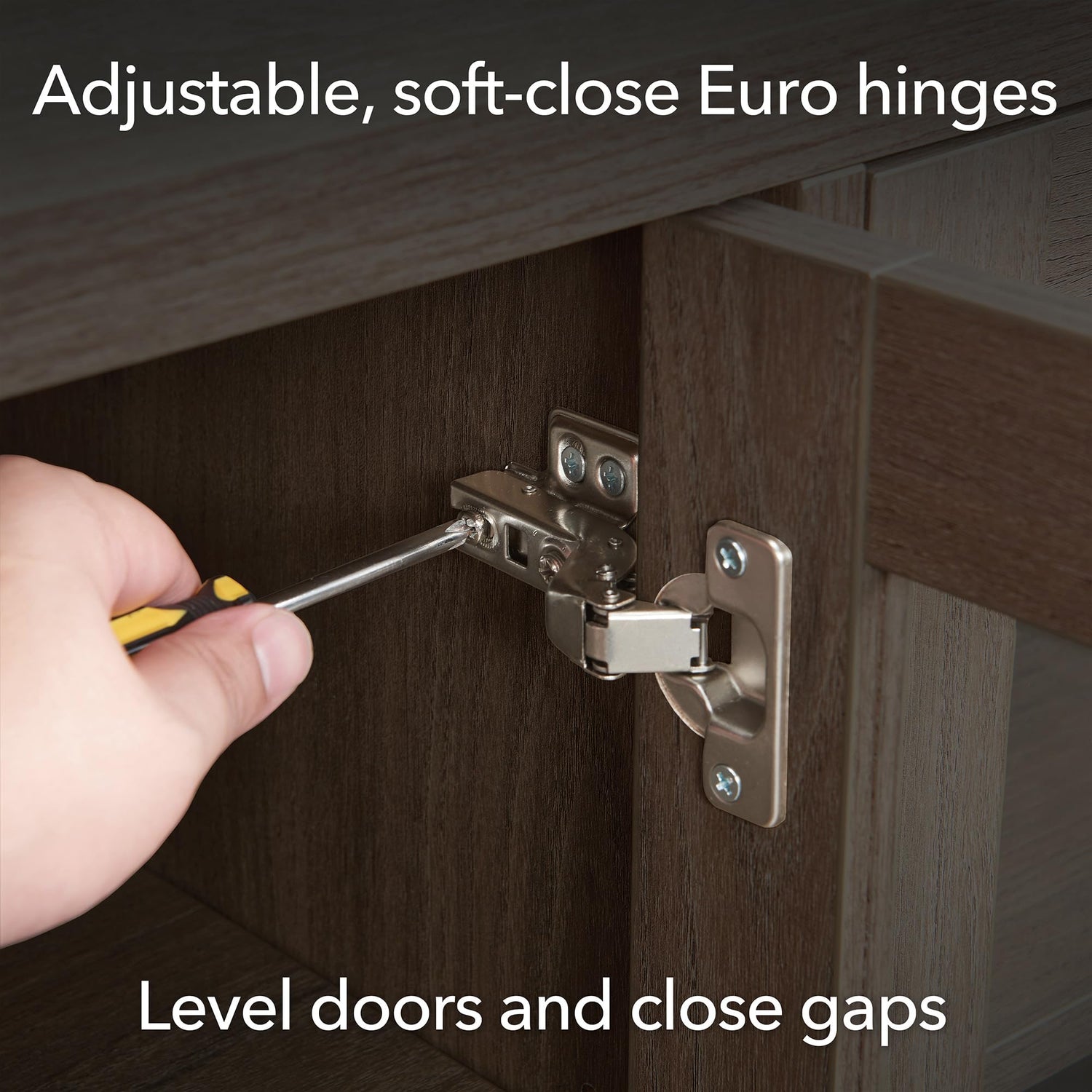 Details: Combine functionality and classic transitional design with this modern TV stand. Its rich wood tone creates a warm neutral palette that will blend seamlessly into any color scheme, while its classic styling pairs perfectly with the existing design inspiration of your living room, den, or game room. This solid-backed stand features two large enclosed cabinets with sleek brass-finished hardware. Cable management cut-outs and adjustable inner shelves help keep your media storage and consoles organized.