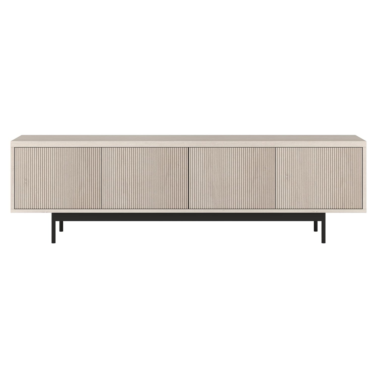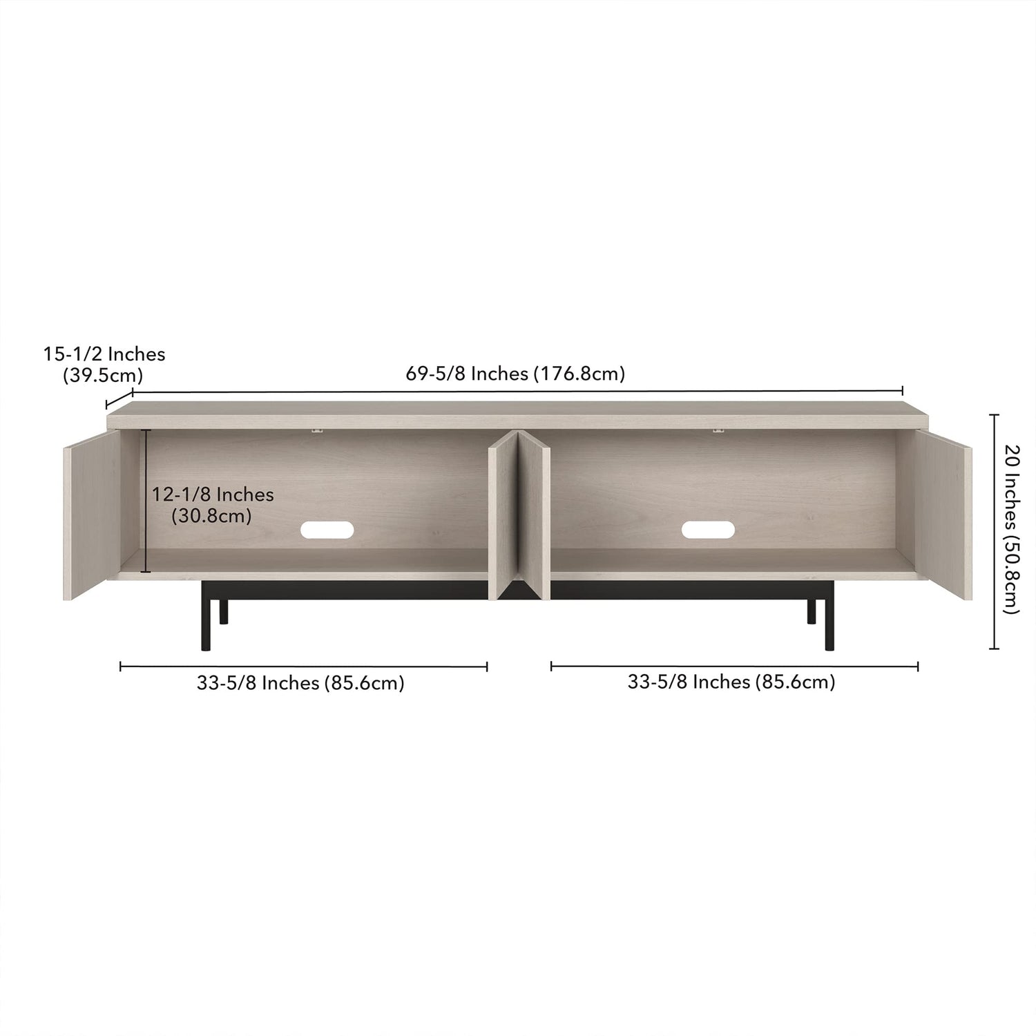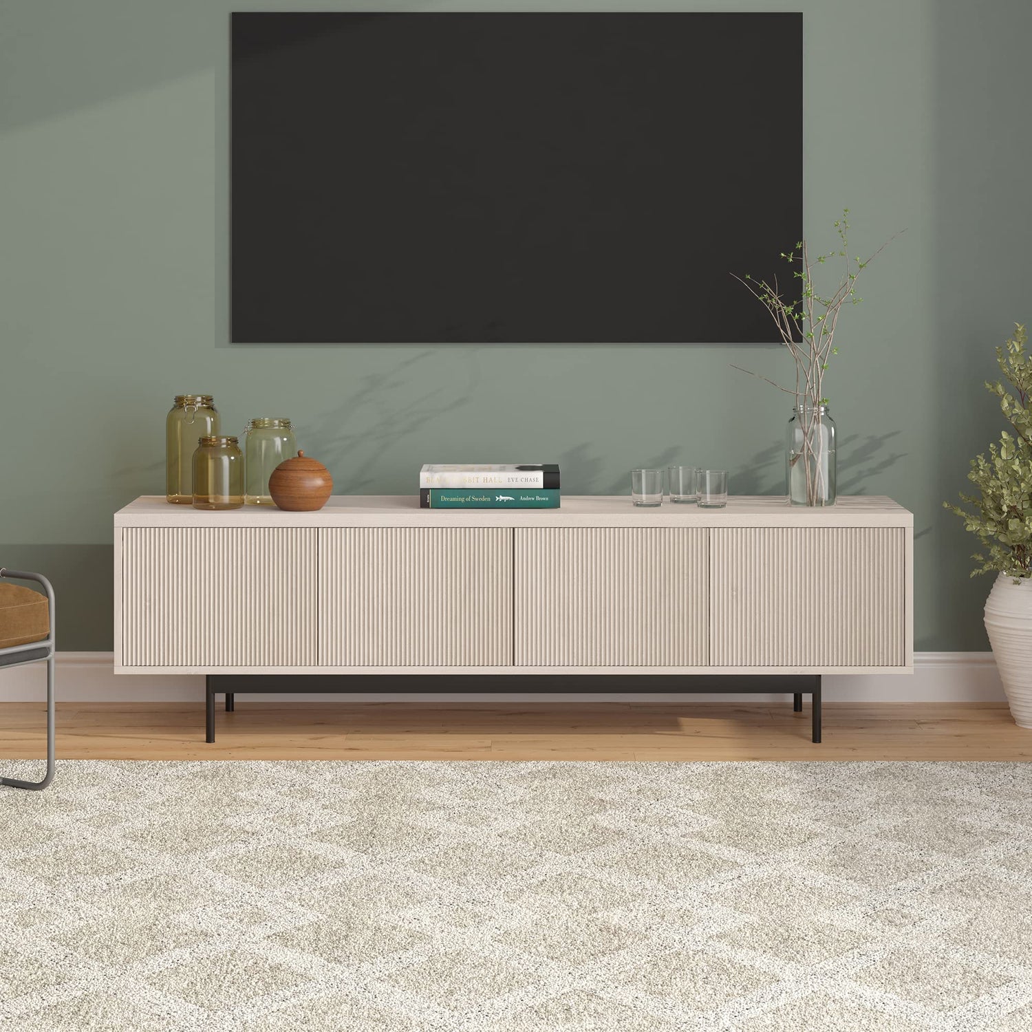 Details: On-trend texture and design combine in this modern TV stand. With a wood grain finish and textured doors, this piece is perfect for your mid-century or minimalist-inspired living room, den, or game room. It's low 20" height leaves plenty of room above for an oversized wall-mounted TV or set of statement lamps. This stand features cable-management cut-outs and 4 fully enclosed doors with an open inside area, allowing for free-form storage of your devices, games, books, and more.