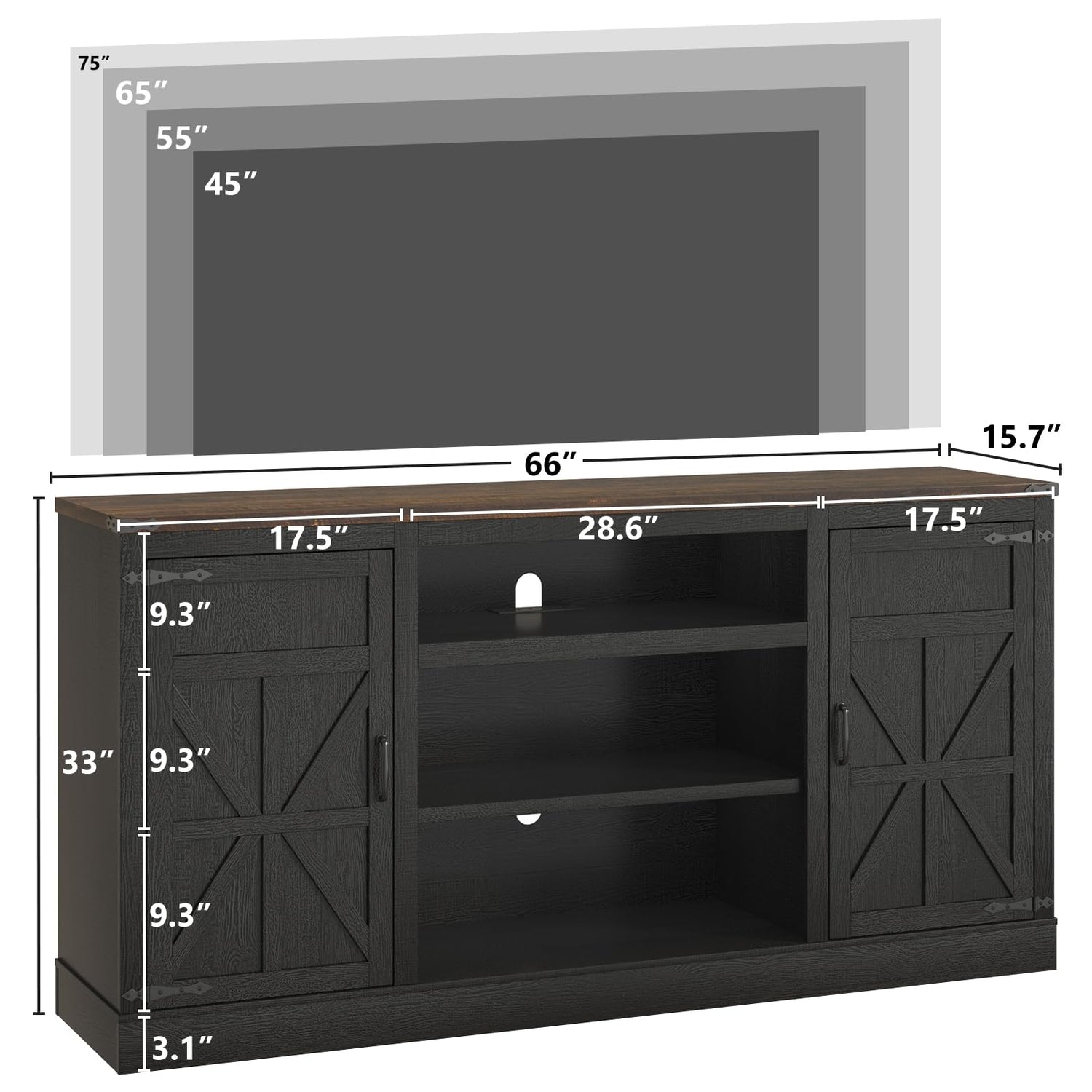 - Farmhouse TV Stand: Our 66-inch farmhouse style TV stand with storage features a unique wood grain finish with metal trim and handles. A great blend of farmhouse style and modernity, adding a beautiful, elegant touch to your living room. 33" tall white TV console can fit well in any space in your home and match with different styles of furniture, and fits screen TVs up to 75''.