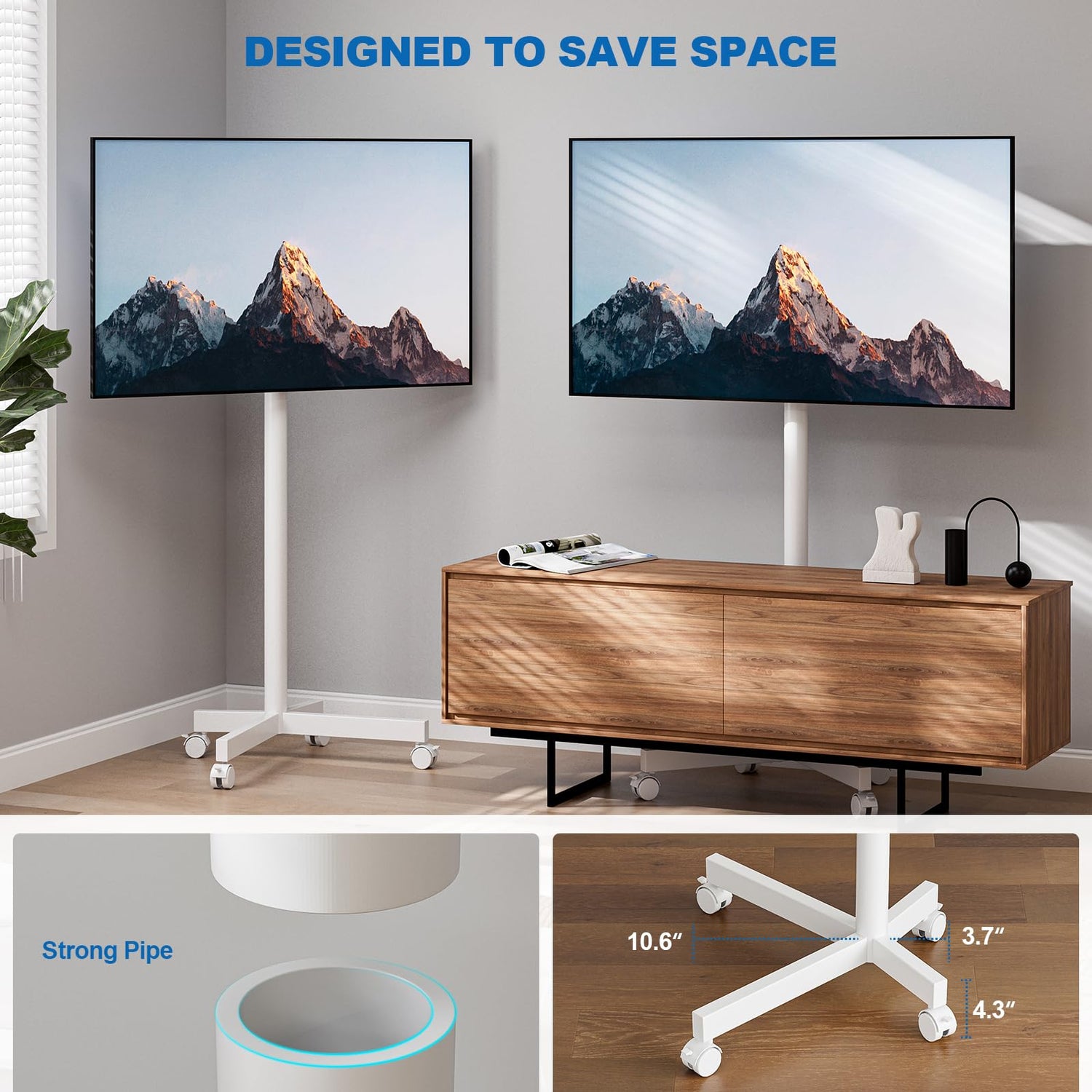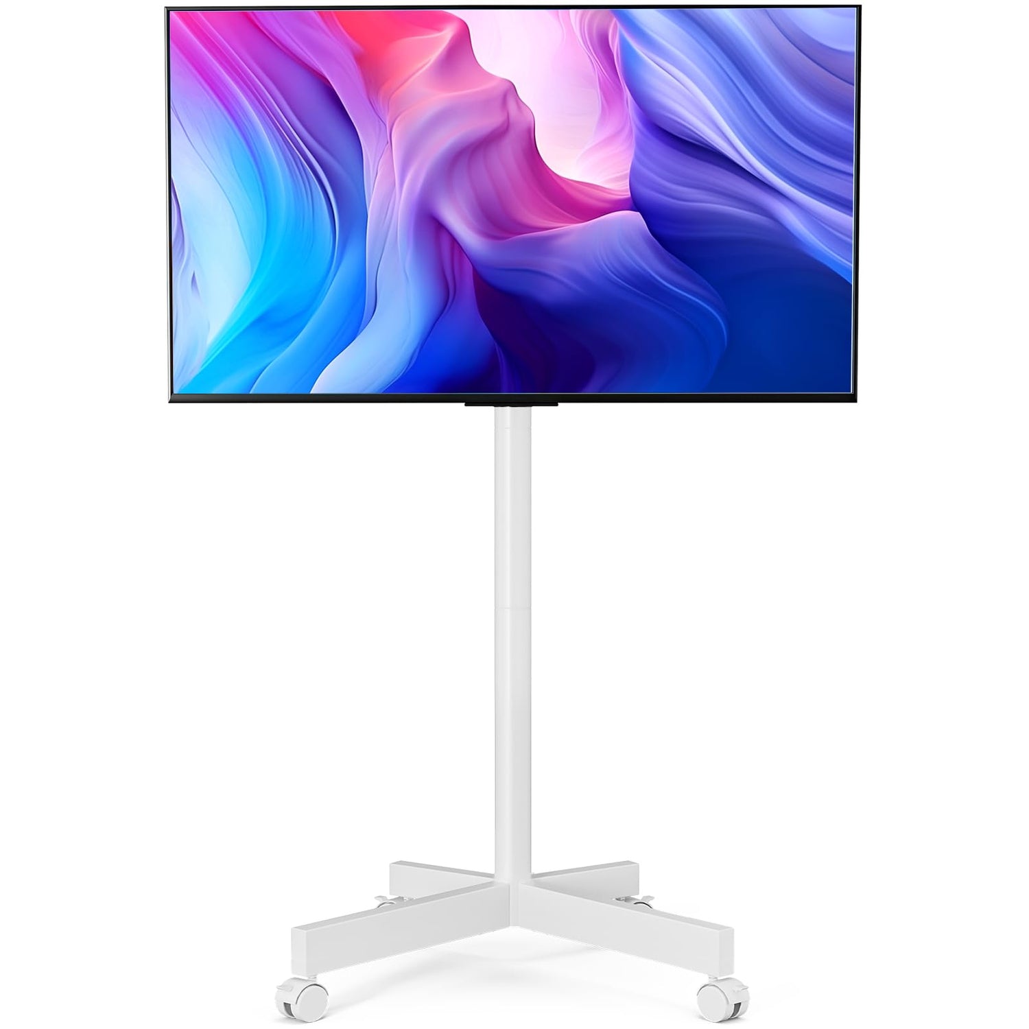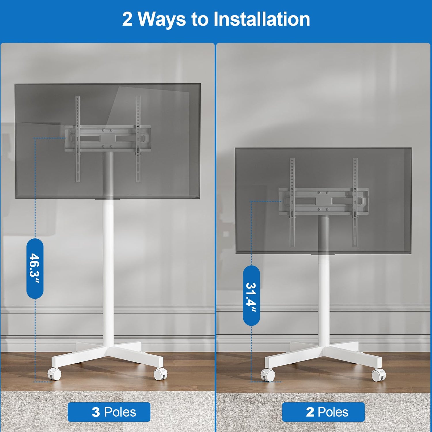 • Sturdy Mobile TV Stand: As a white tv stand, it's made of tough alloy steel, providing strong support for your TV. You don't need to worry about the risk of the tv falling. This tv stand with wheels allows you to move this stand with peace of mind to any space you want to use. You no longer need to drill holes in the wall for installation. The tv floor stand won't damage your original decoration. All wires can be tied to the pole, which is not only easy to clean but also safe.