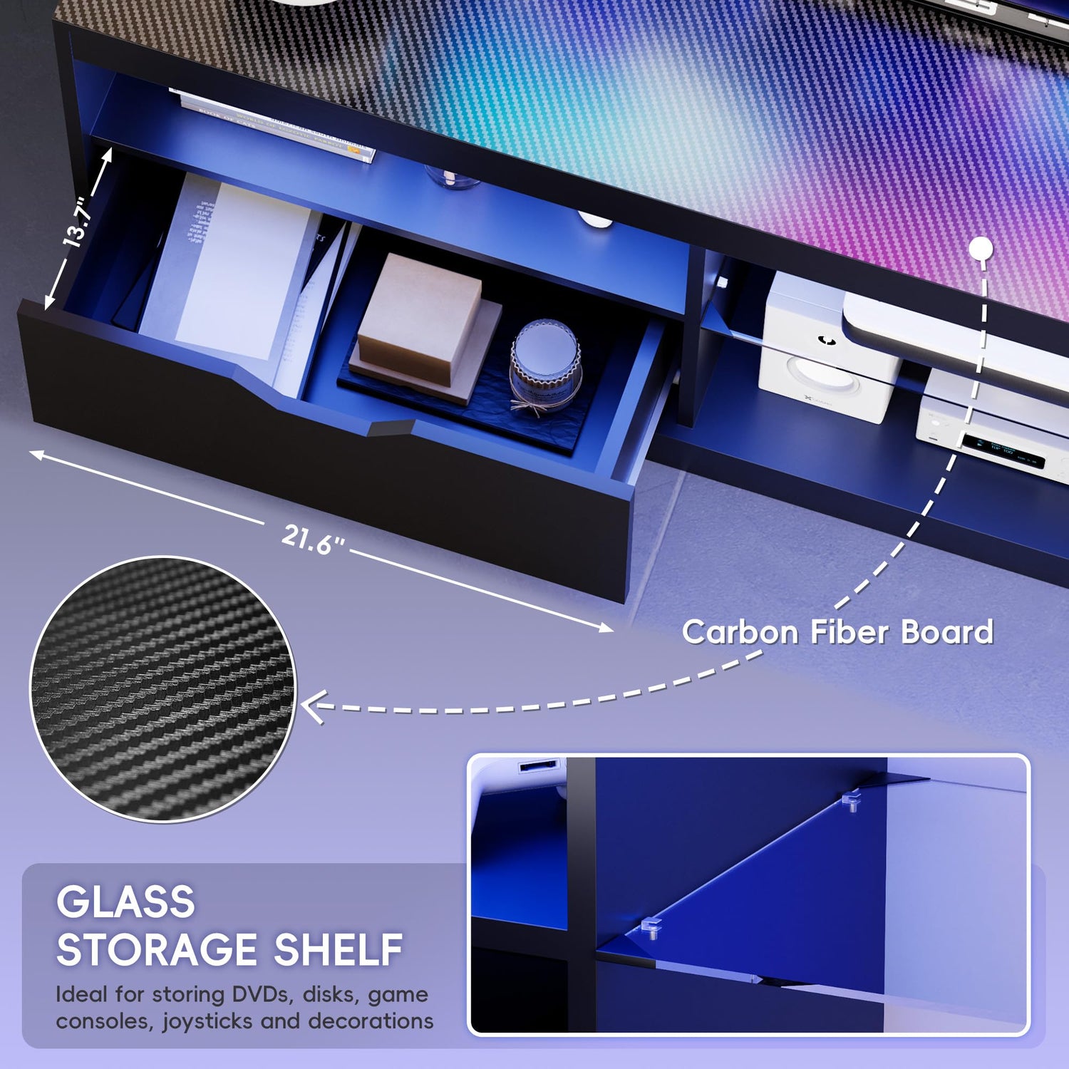 - LED TV Stand: With 20 fixed color options and 19 dazzling flashing modes, this TV stand is designed to create an immersive entertainment environment. Its dynamic RGB lighting system further enhances the enjoyment of entertainment and adds a touch of ambiance and elegance to your home.