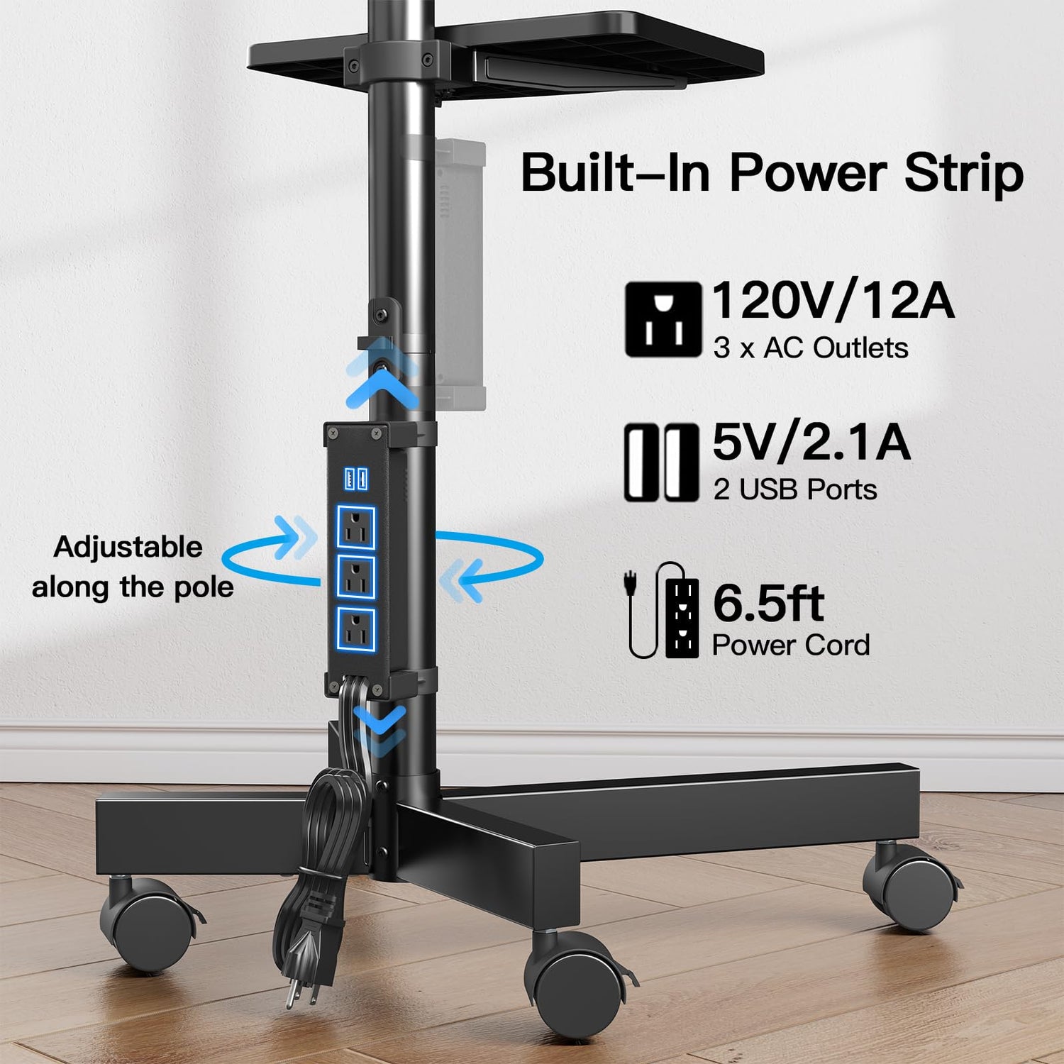 - Adjustable Power Strip: With 3 AC outlets, 2 USB ports, and a long 6.5 ft power cord, our rolling TV stand provides all the connectivity that you need. The clip-on power strip is adjustable along the TV cart pole for easy positioning to keep cables tidy and organized.