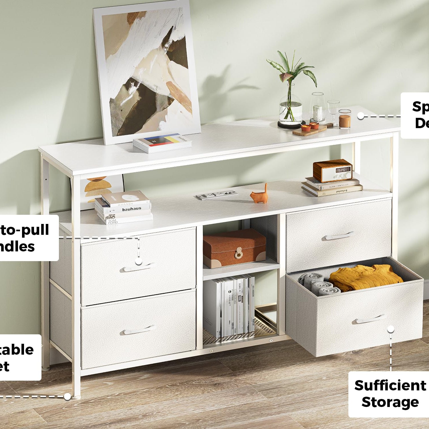 - 【Support Tv & Ample Storage】Want a TV stand without taking a lot of space? Look at it. 4 fabric drawers with PU finish, spacious desktop and open shelf offer sufficient storage for your TV accessaries. The detachable middle shelf can store tall or short items like loudspeaker box. This TV stand with storage is also a reliable support for your TV (Up to 50 inches)