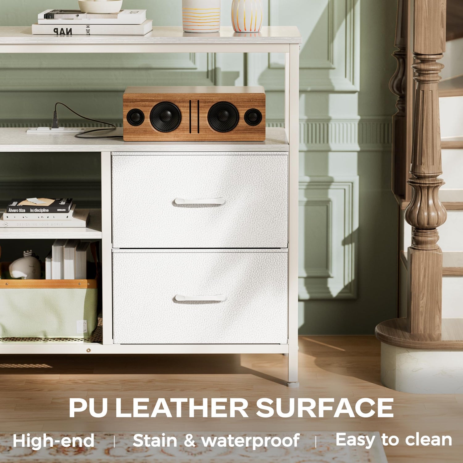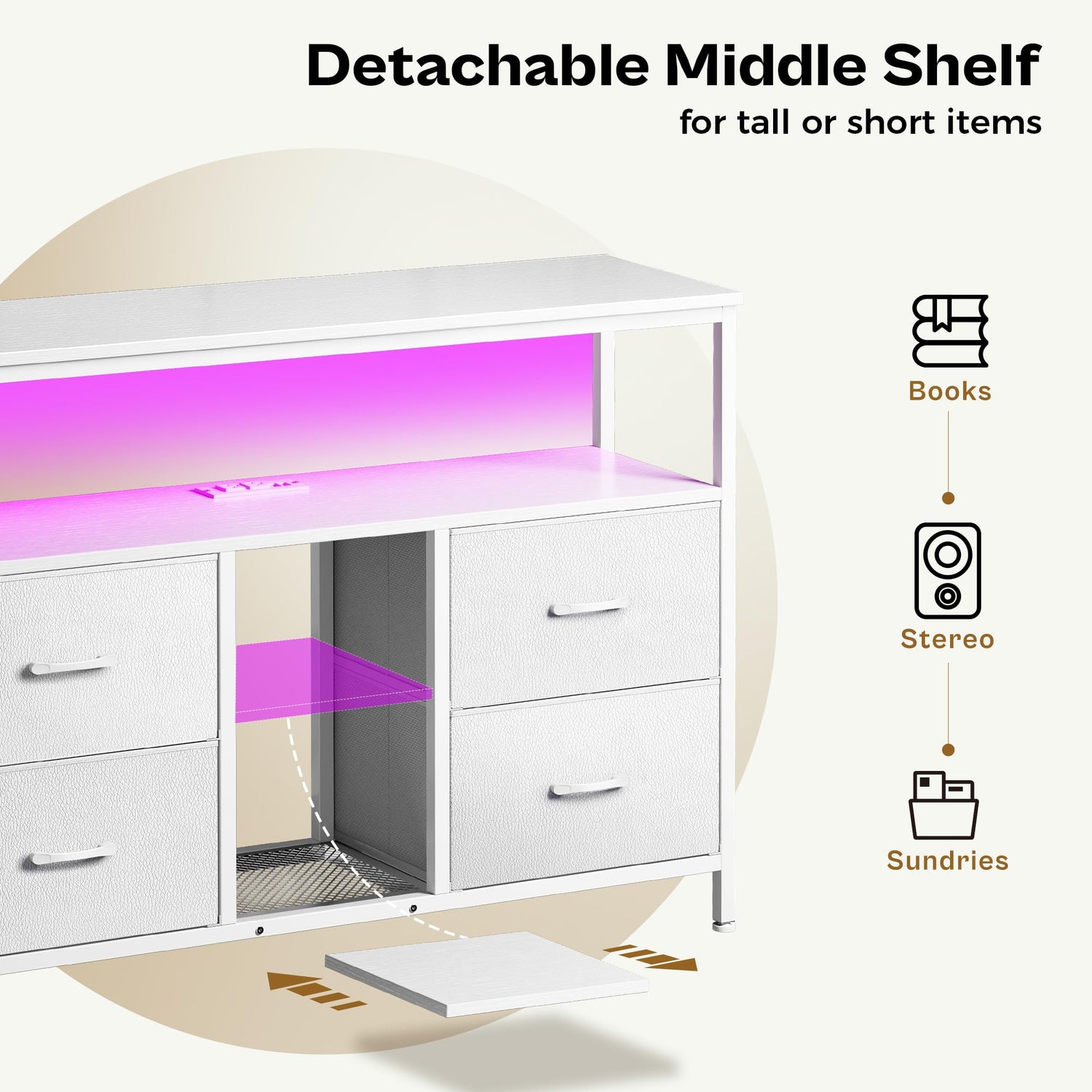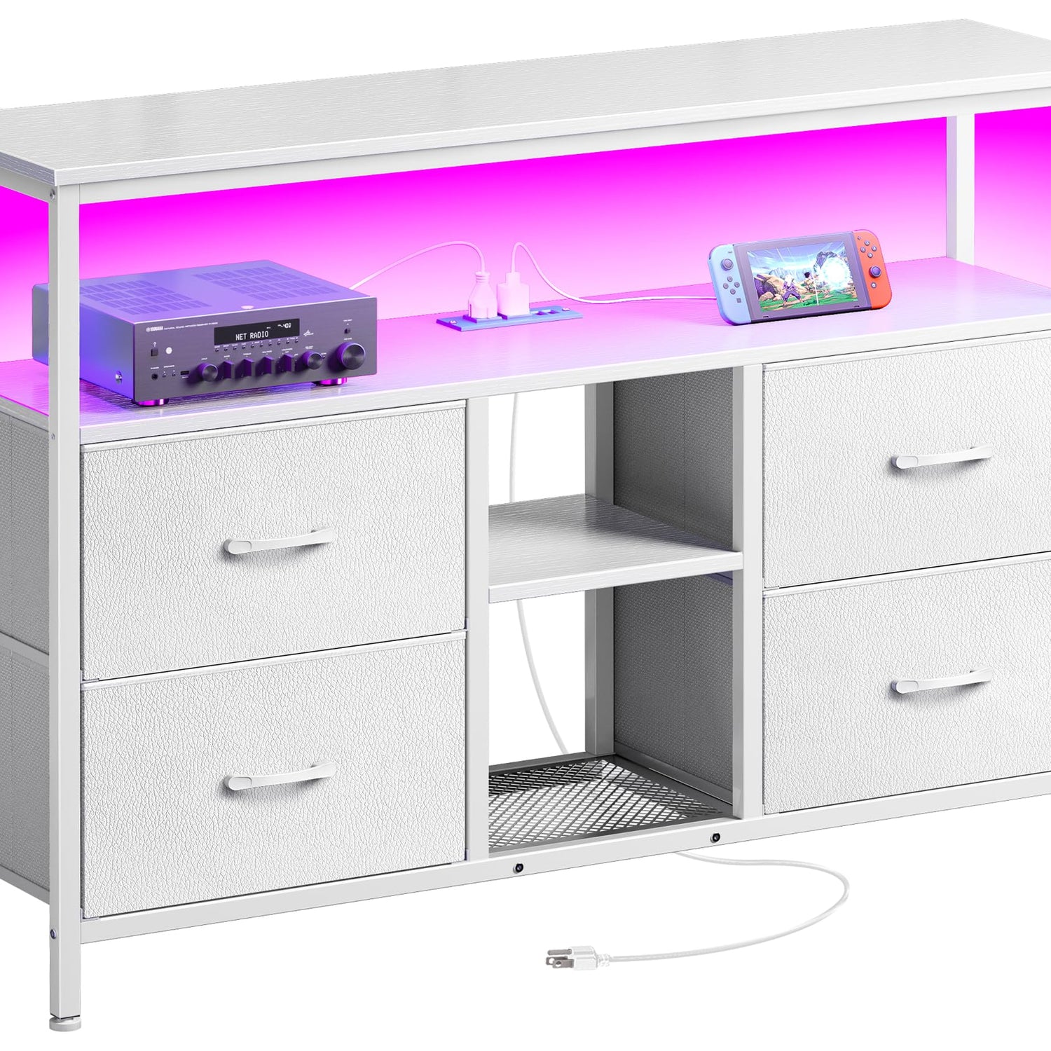 Huuger TV Stand Dresser with Power Outlets and LED Lights, 4 Drawers Entertainment Center with Open Shelf, Media Console for 50 43 Inch TV, Dresser with PU Finish, White