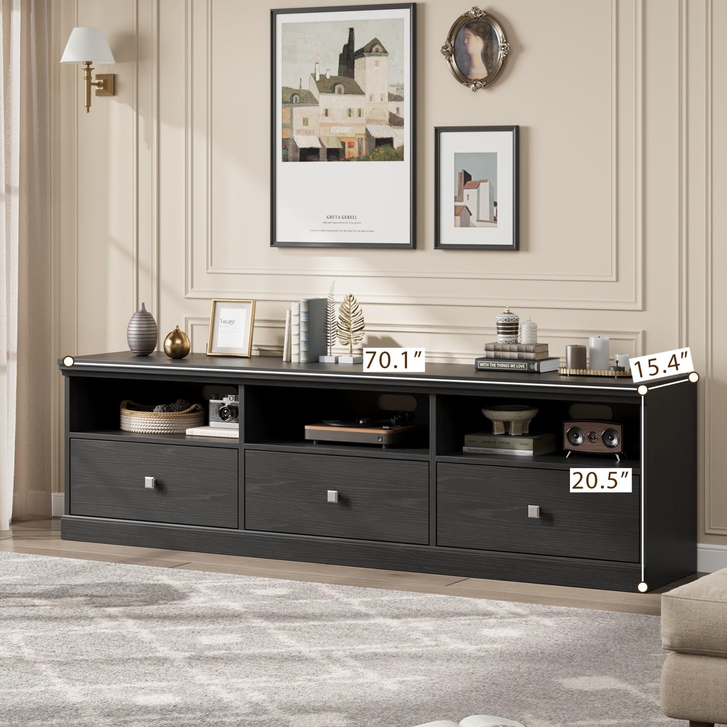 - DIMENSIONS & STORAGE: This tv cabinet measures 70” L x 15.4” W x 20.5” H and accommodates flat or curved TVs up to 75 inches. The tv console table provides ample storage space with a combination of open shelves for decor and media devices, plus drawers to neatly stow away remotes, cables, and other essentials