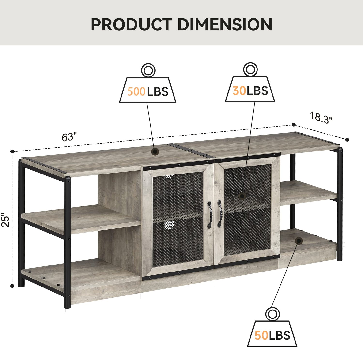 - √ PRODUCT DIMENSIONS: The industrial TV stand overall size is 63” L x 18.3” W x 25” H. It is suitable for flat screen and curved TVs up to 70 inches. The clean-lined and scientific and rational layout ensures ample storage space. The Industrial entertainment center gives you ample storage space for media players, game consoles, photo frames, plants, books, tv components, and any other home decor art to keep your living room clean and away from sundries.