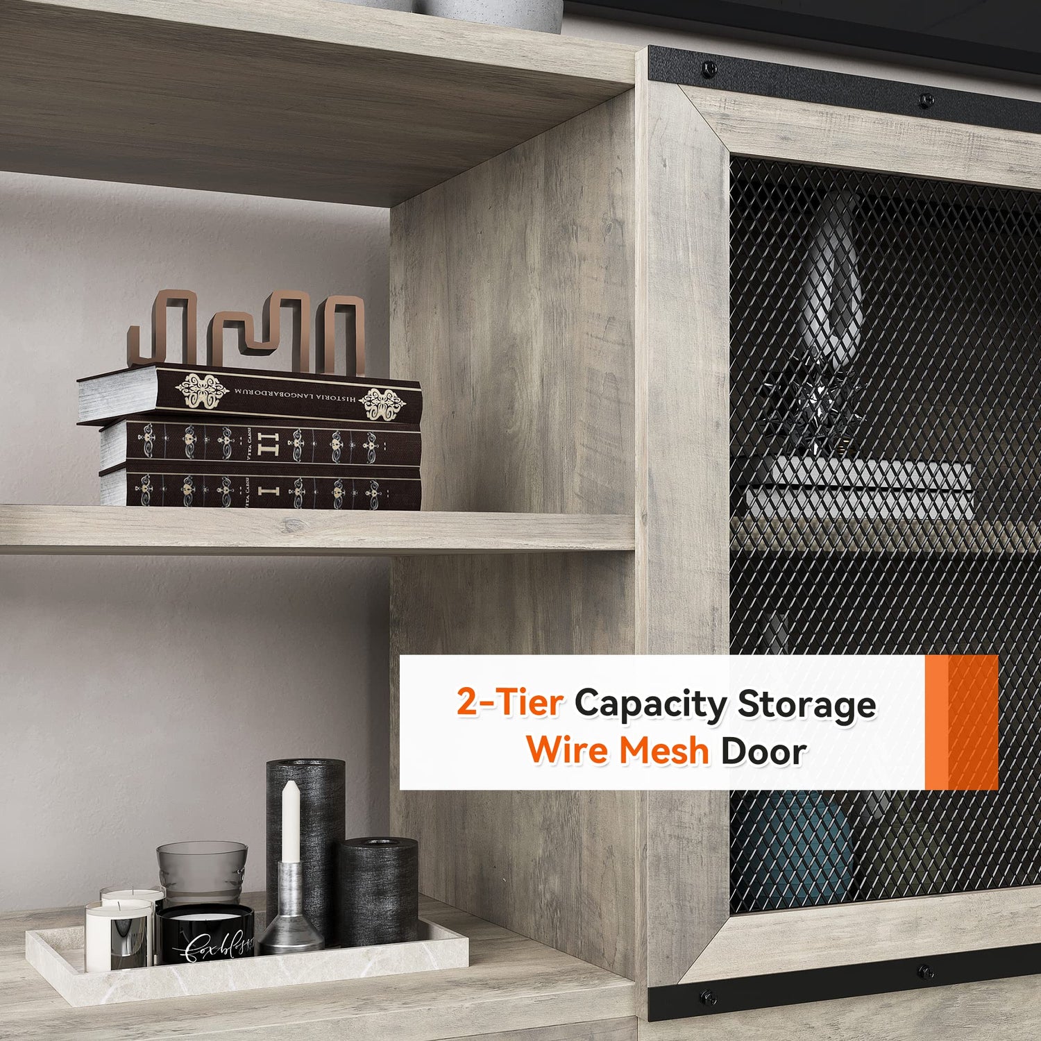 - √ CHIC ENTERTAINMENT CENTER: The Entertainment center adopts a visual mesh door designed to allow you to hide or reveal this home entertainment center freely, and flexibly divide it into different storage and display area. Designed with cable holes on the back of the farmhouse TV console table to store extra cables, this TV stand cleverly hides clutter, big or small. There is 10 inches of space between each tier, allowing you to place bulky items.