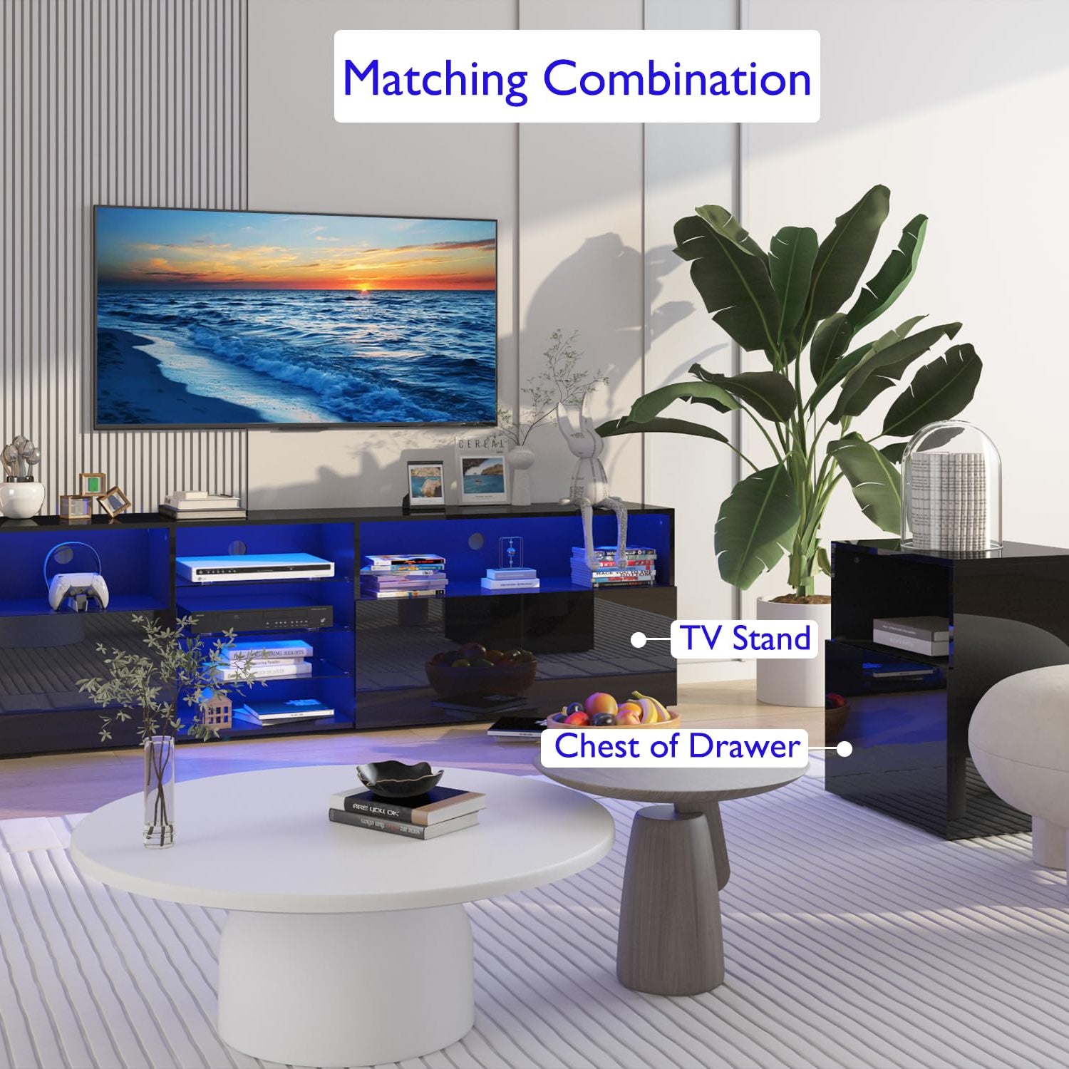 - High Glossy Large TV Stand :The High glossy TV stand has front full high gloss visible on the front surface.Made of UV high glossy coated P2 grade particleboard, and the smooth paint process, this TV stand is scratch proof and waterproof,with up to 300 pounds bearing capacity.