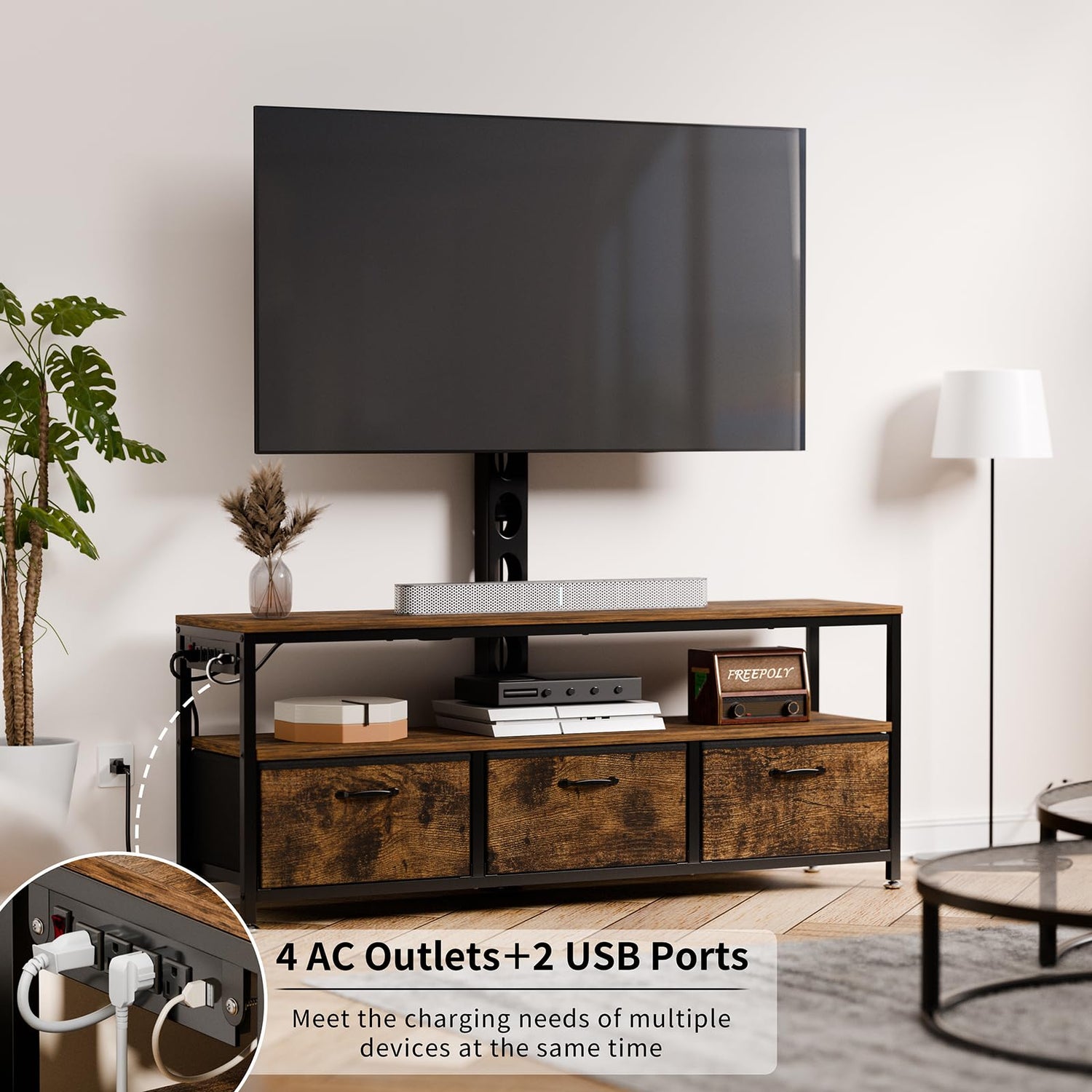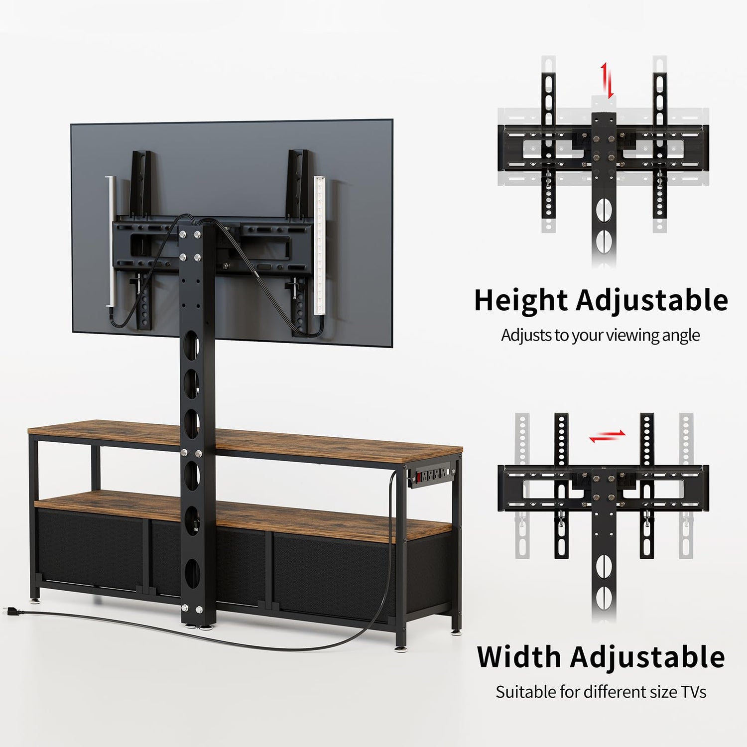 - 【STURDY TV STAND MOUNT】This universal adjustable TV stand is compatible with and securely holds 32 to 65 inches TVs. The sturdy base and support make it easy for the table to hold 110 LBS, while the stand can support 200 LBS. Equipped with 4 power outlets, providing a convenient charging solution for a variety of media devices.
