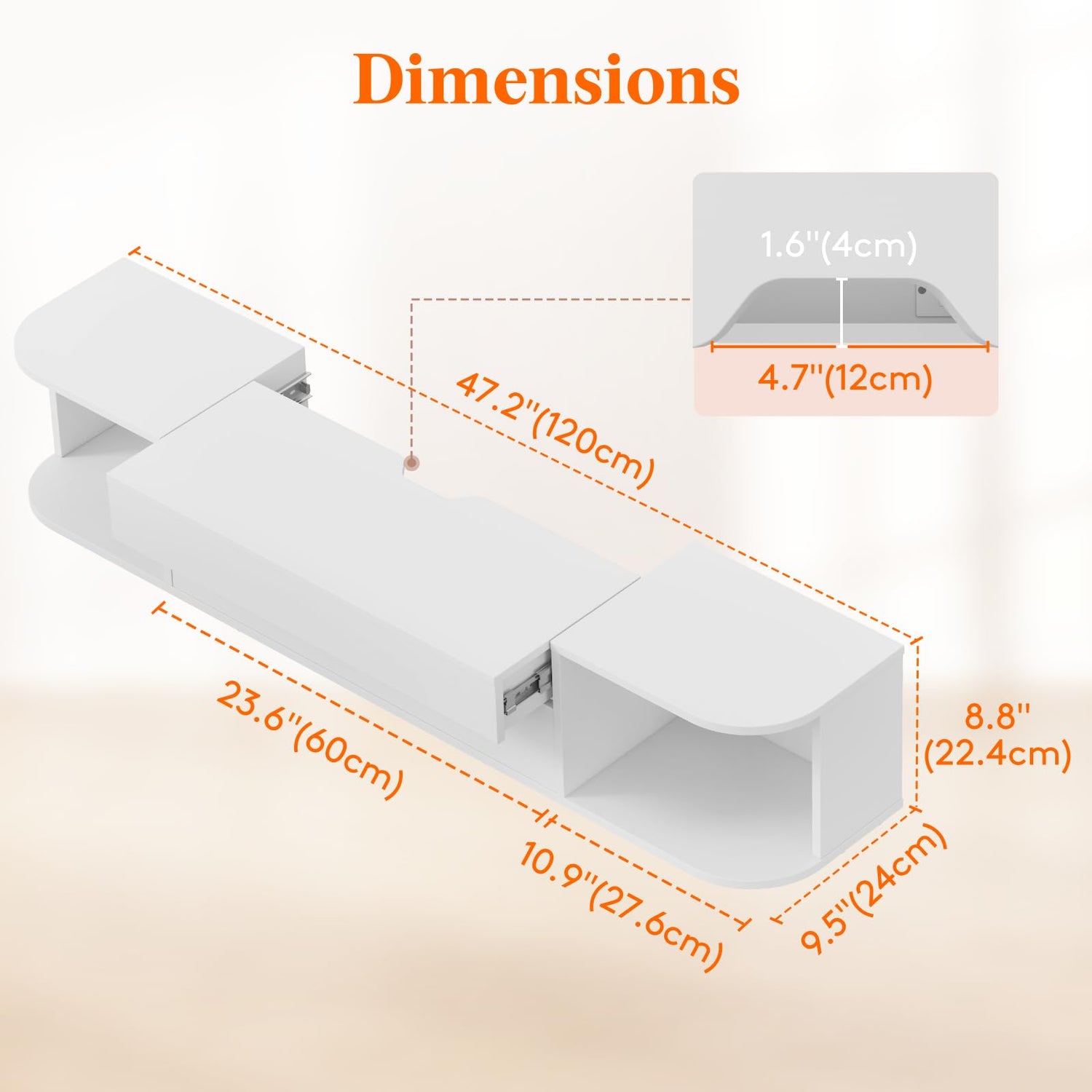 - Outstanding Quality and Durability: Made with high-quality hardware and MDF, this floating tv stand shelf is scratch-resistant, waterproof, and easy-to-clean; solidly built for long-term use; dimensions: 47.2 x 8.8 x 9.5 in (120 x 22.4 x 24 cm)