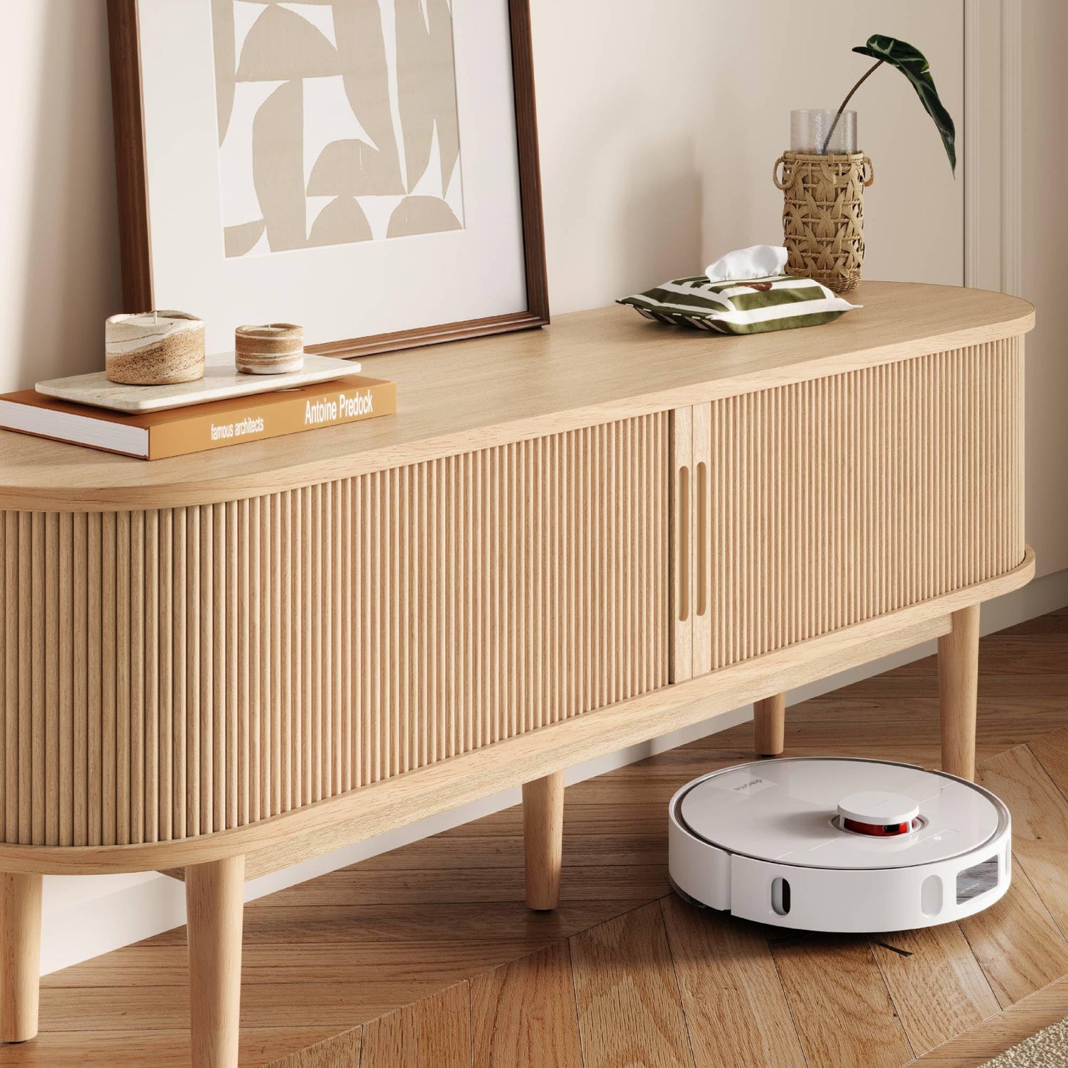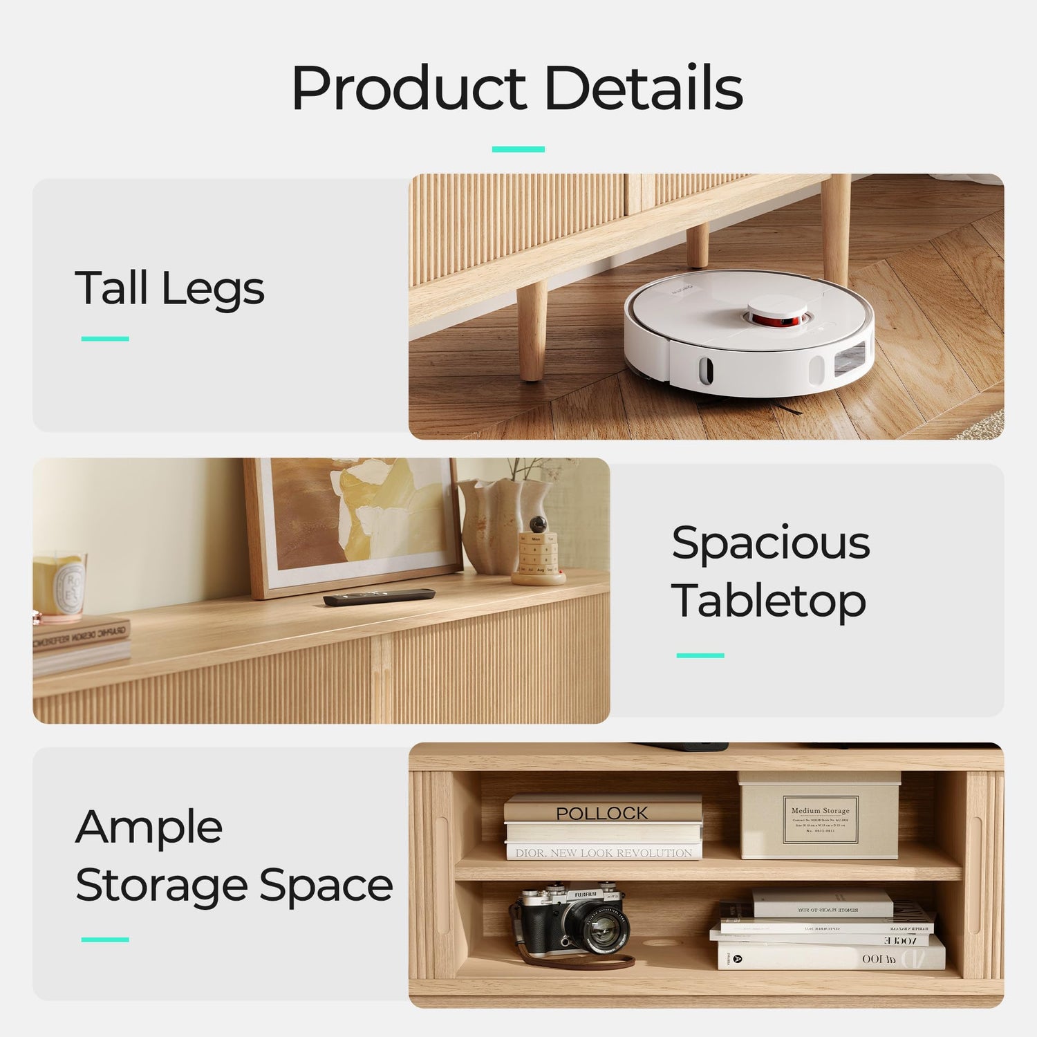 - Fluted Tambour Sliding Door - With its distinctive curved silhouette and slatted tambour sliding door design in a mid-century style oak color, this TV stand effortlessly integrates into your living room, bringing a touch of sophistication and a warm, welcoming ambiance to your space