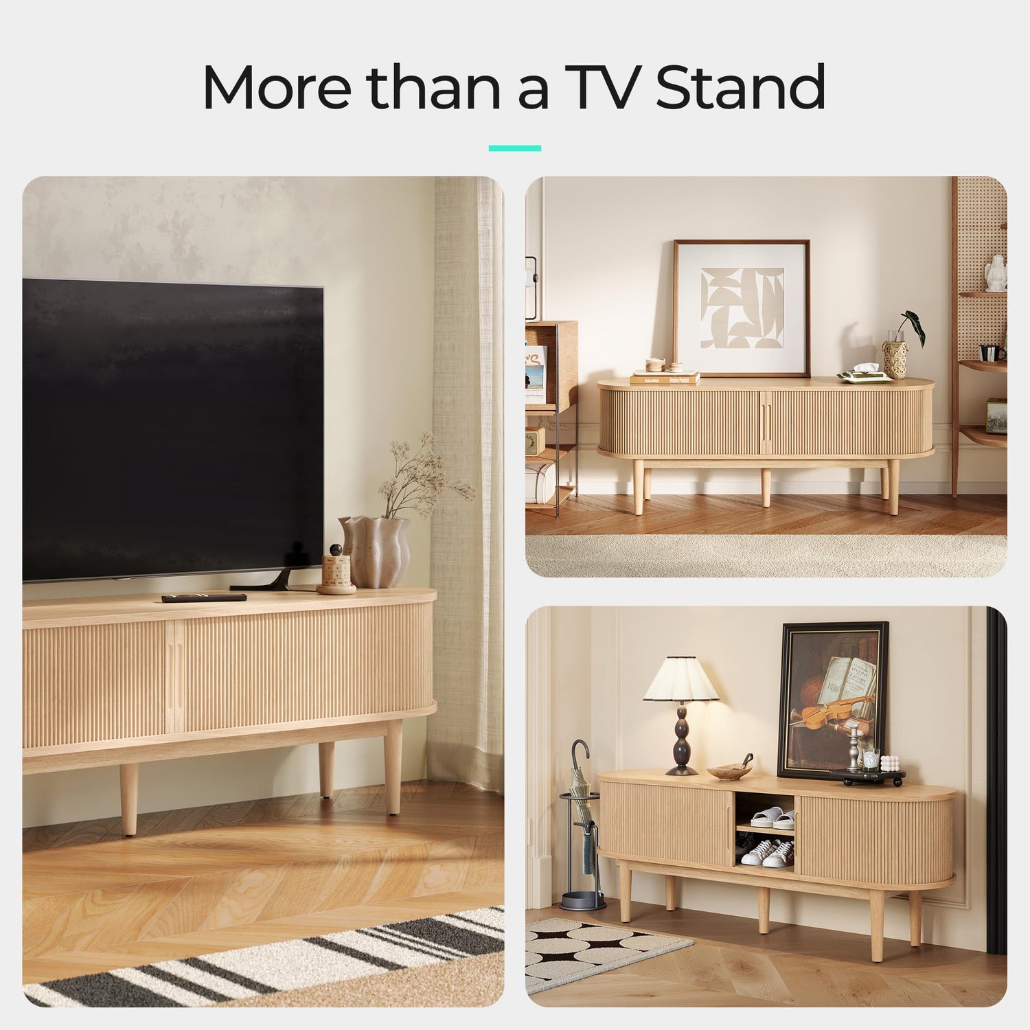LINSY HOME TV Stand for 65" TV, Mid-Century Modern 58" Entertainment Center with Sliding Tambour Door and Storage Cabinet, Cruved TV Media Console Table for Living Room, Bedroom, Oak