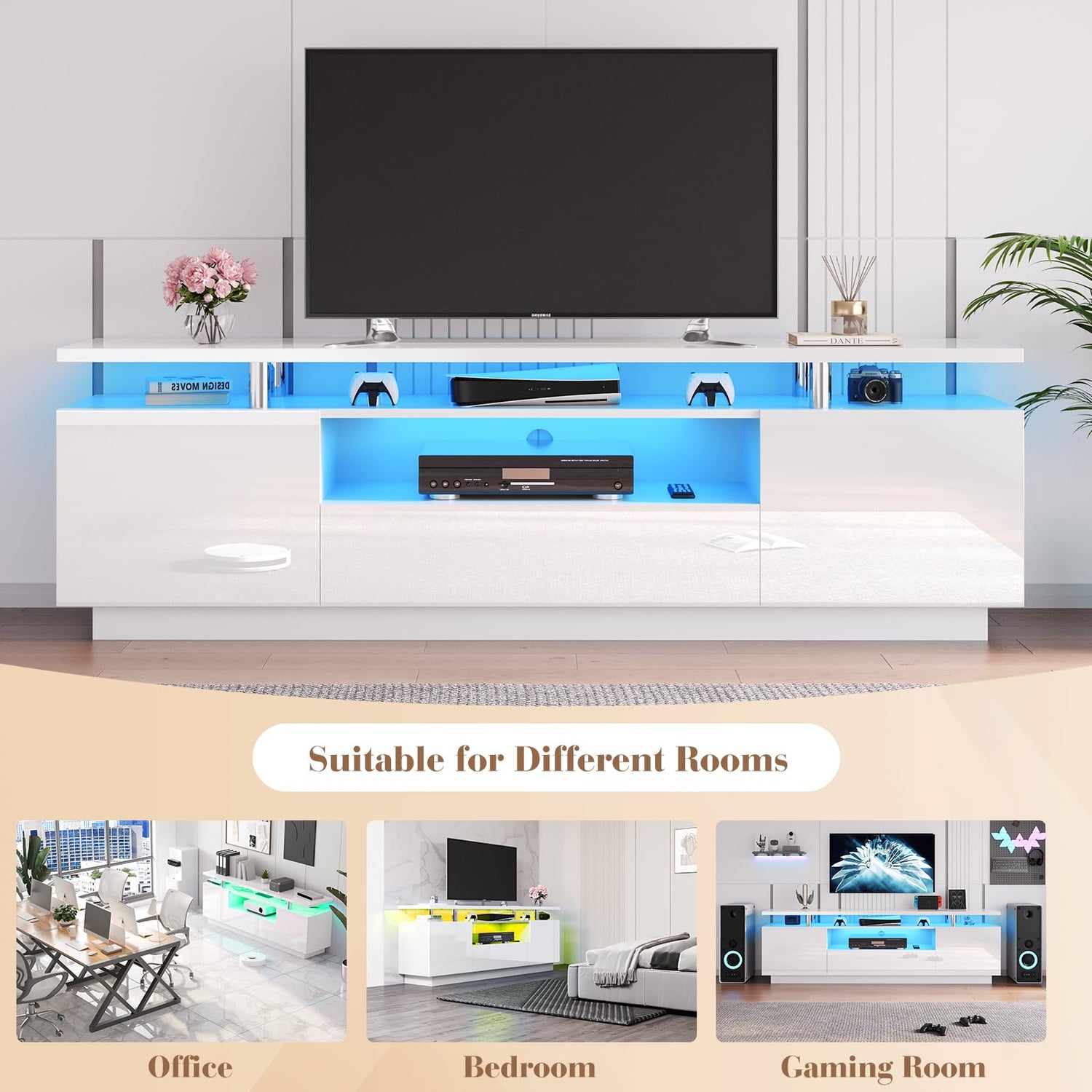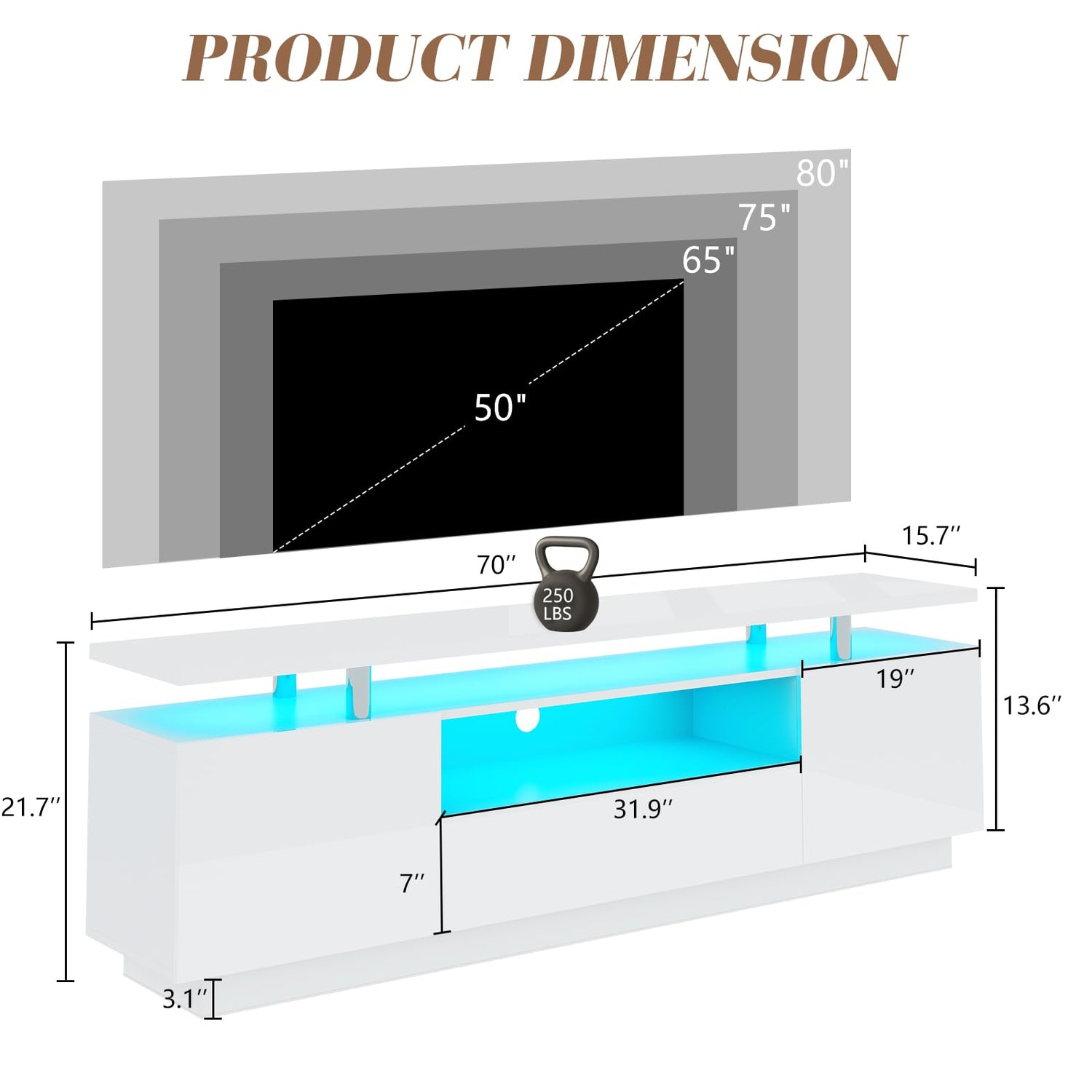 LUXOAK 70in LED TV Stand, Modern Entertainment Center with Open Storage Shelves and Drawer for TVs Up to 80", High Gloss Media for Living Room, Bedroom, Gaming Room, White