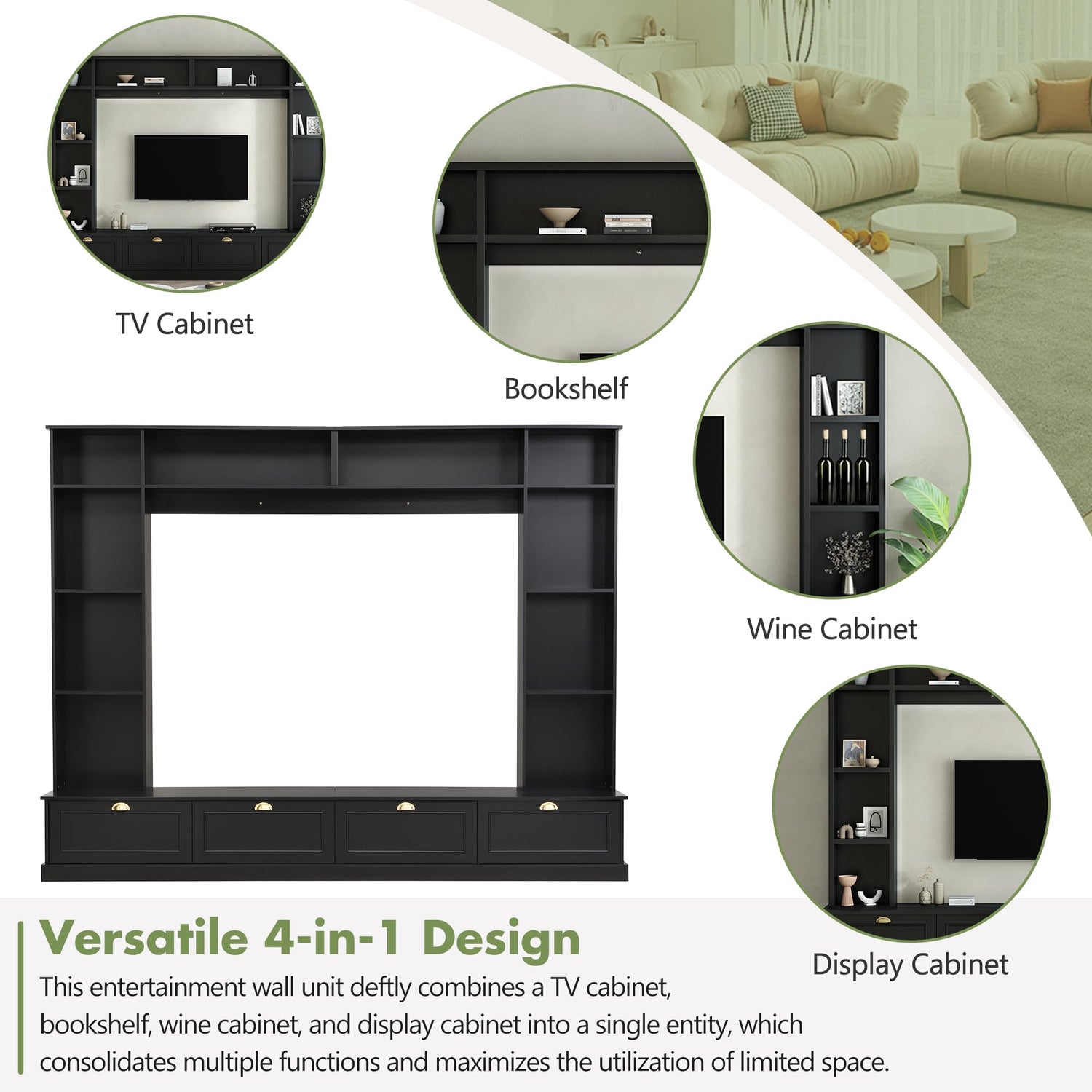 Merax Large Wall Unit Entertainment Center with Bookshelves for Televisions Up to 78'', Modern 4-in-1 TV Stand with Cabinets, Open Shelves and Golden Handles, Black, 104.2''W*81.2''H