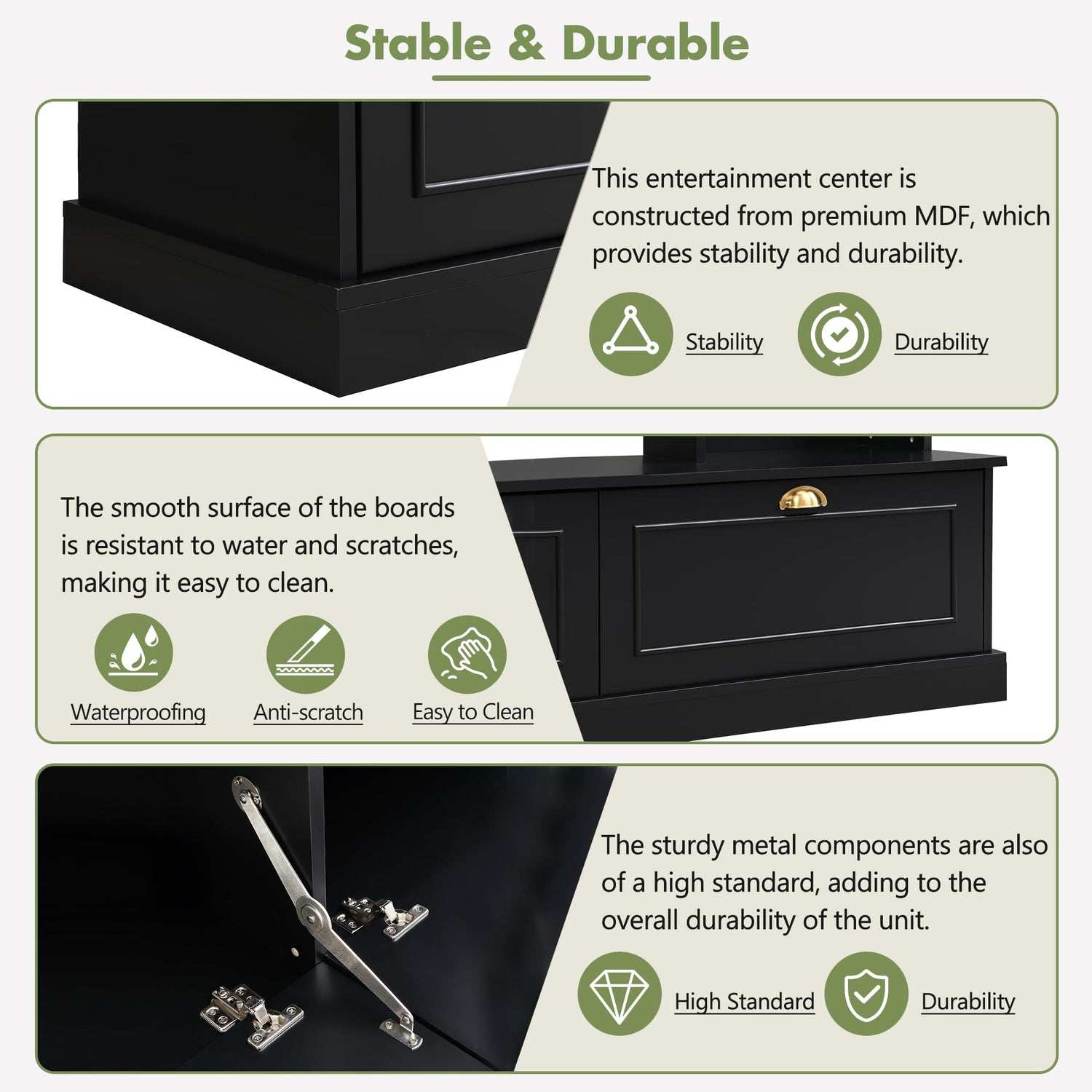 - This entertainment center is constructed from premium MDF, which provides stability and durability. The smooth surface of the boards is resistant to water and scratches, making it easy to clean. The sturdy metal components are also of a high standard, adding to the overall durability of the unit.