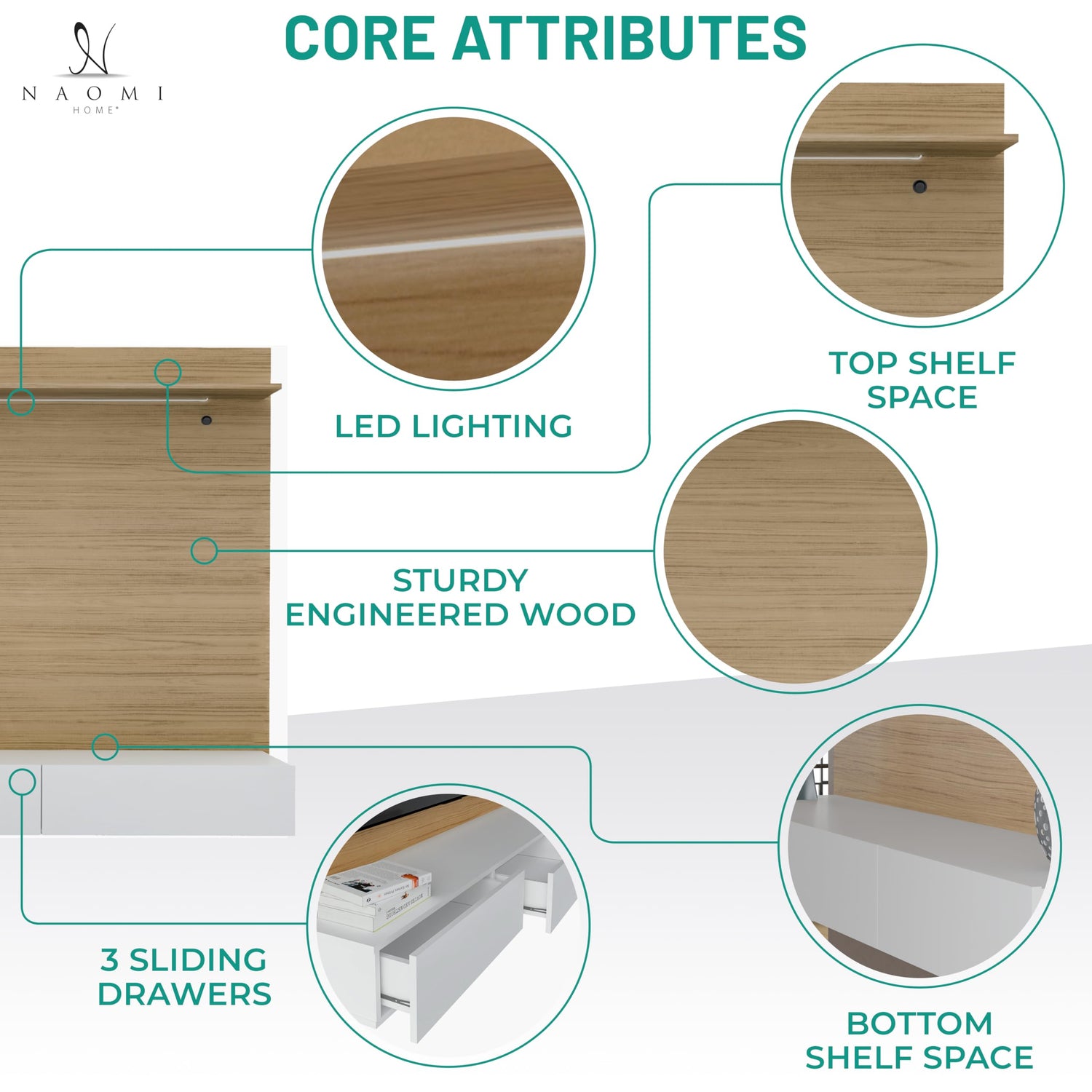 Modern Freestanding Floating Entertainment Center Floating TV Stand Wall Mounted TV Wall Panel for 75 inch TVs Home Theater with LED Strip Pull - Out Drawers and Overhead Shelf Natural