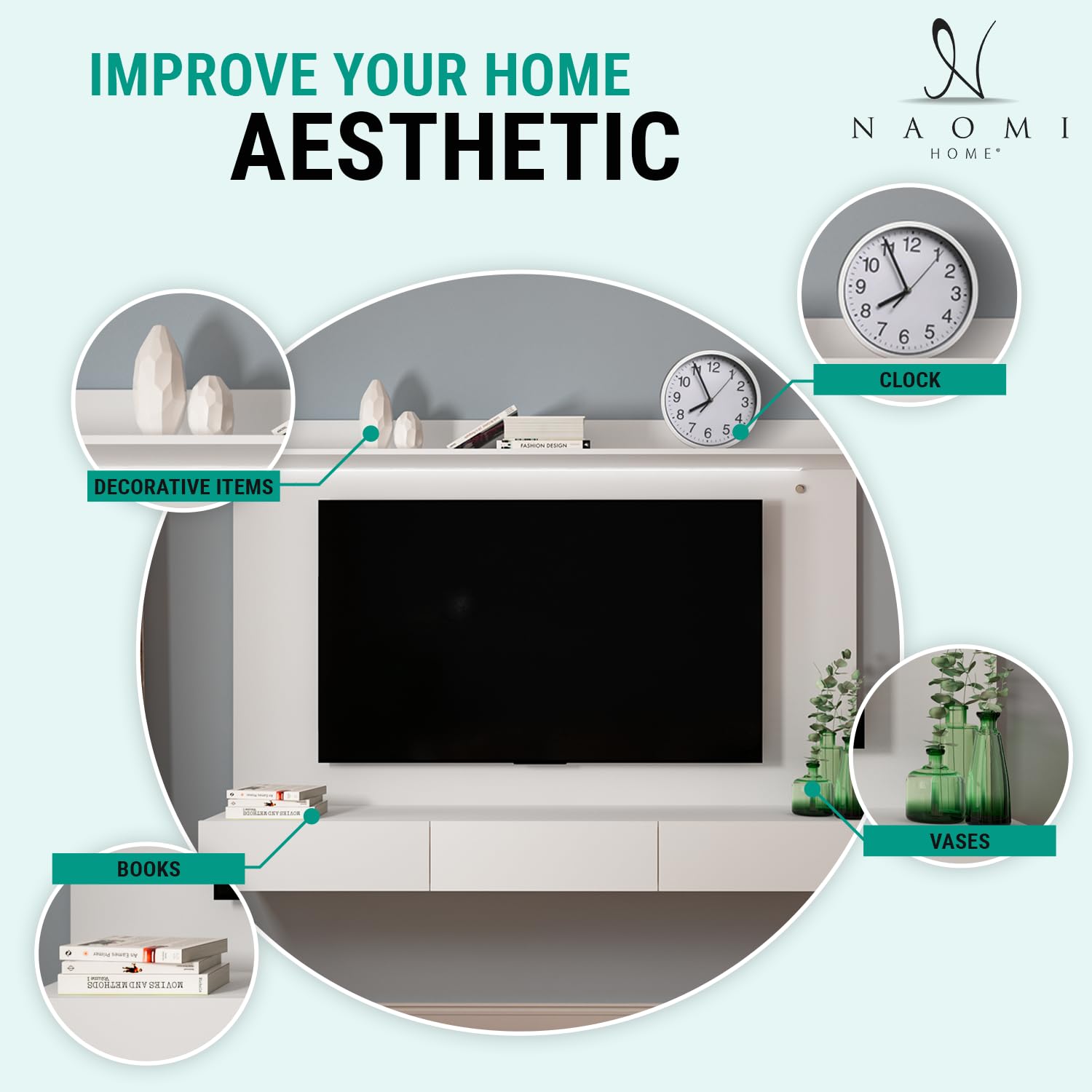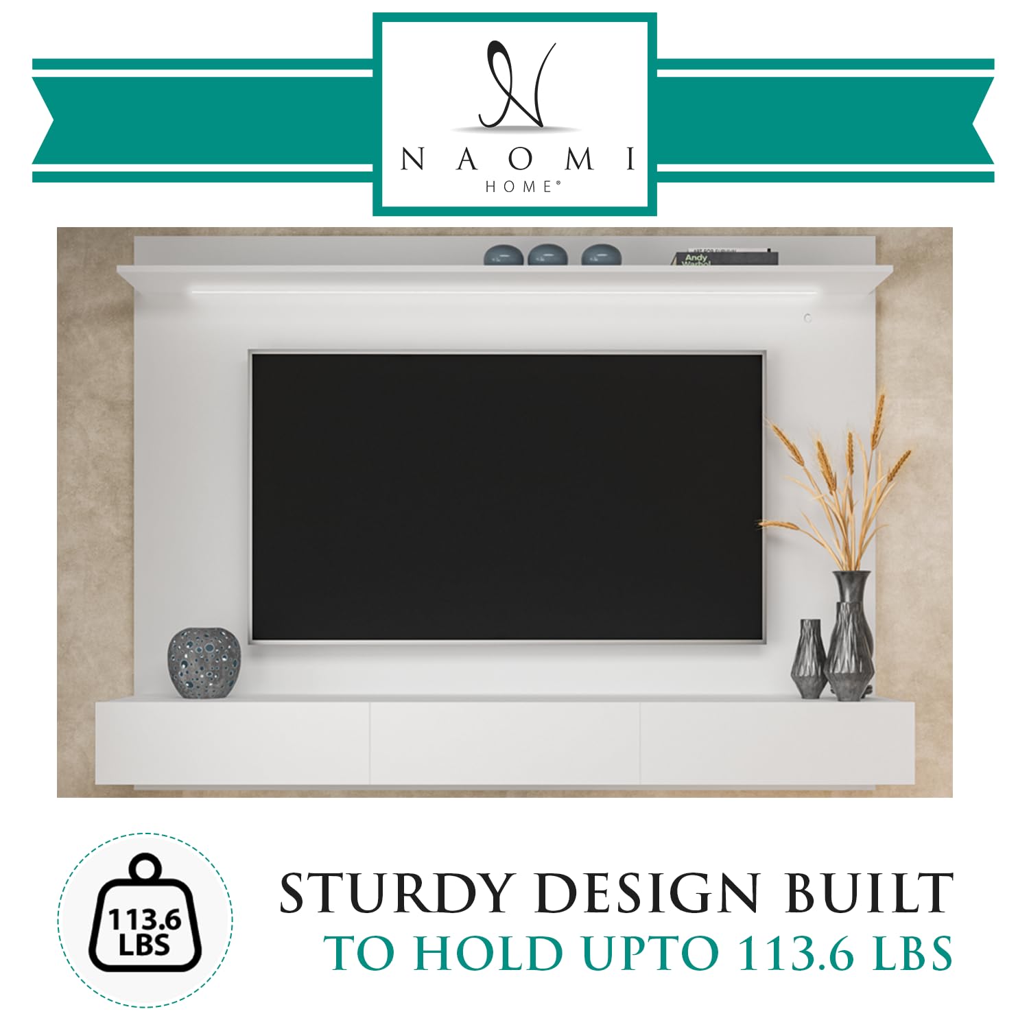 Naomi Home Bliss Modern Freestanding Wall Mounted Entertainment Center Floating TV Wall Panel for 70 inch TVs, Home Theater with LED Strip, Pull-Out Drawers and Overhead Shelf – White, Pine Wood