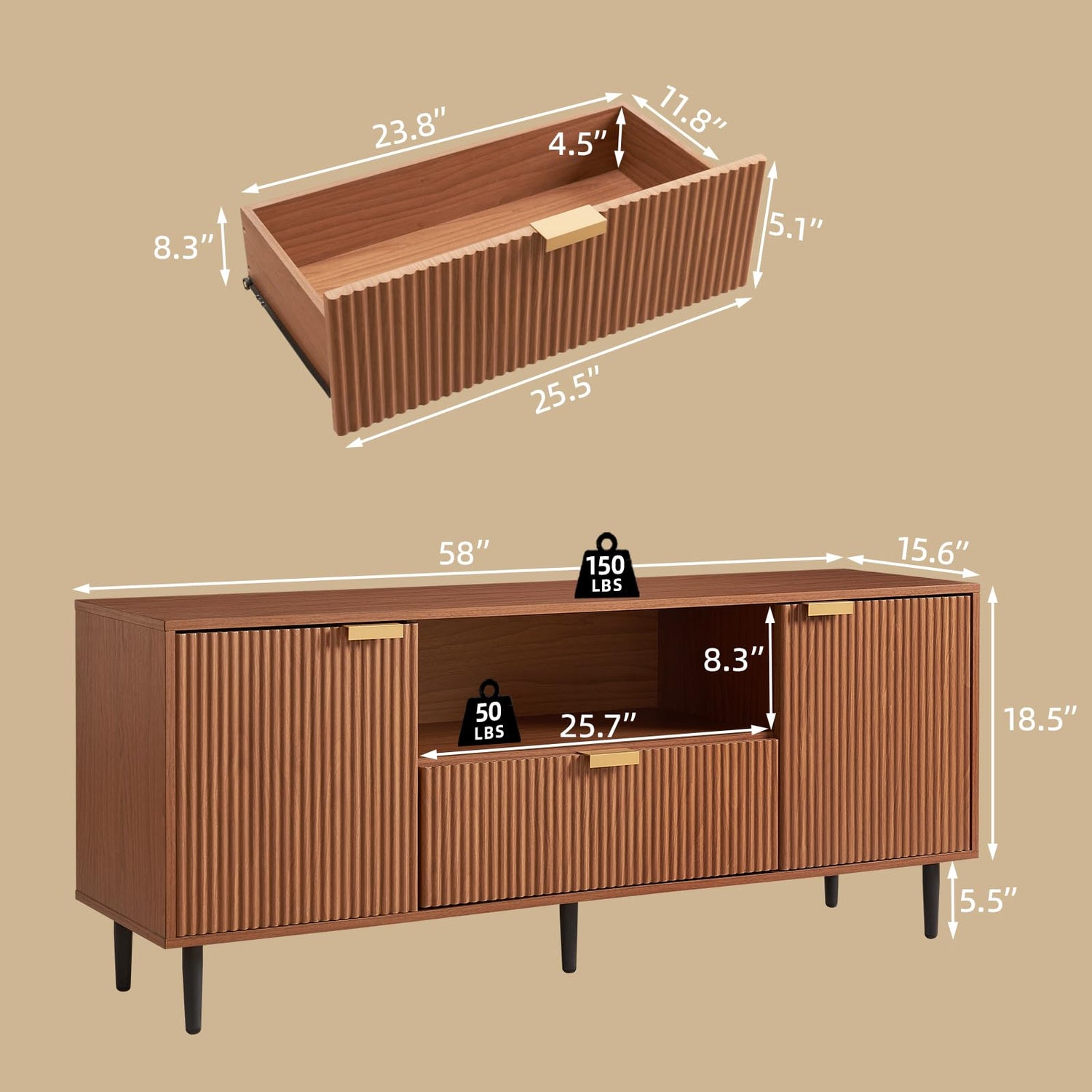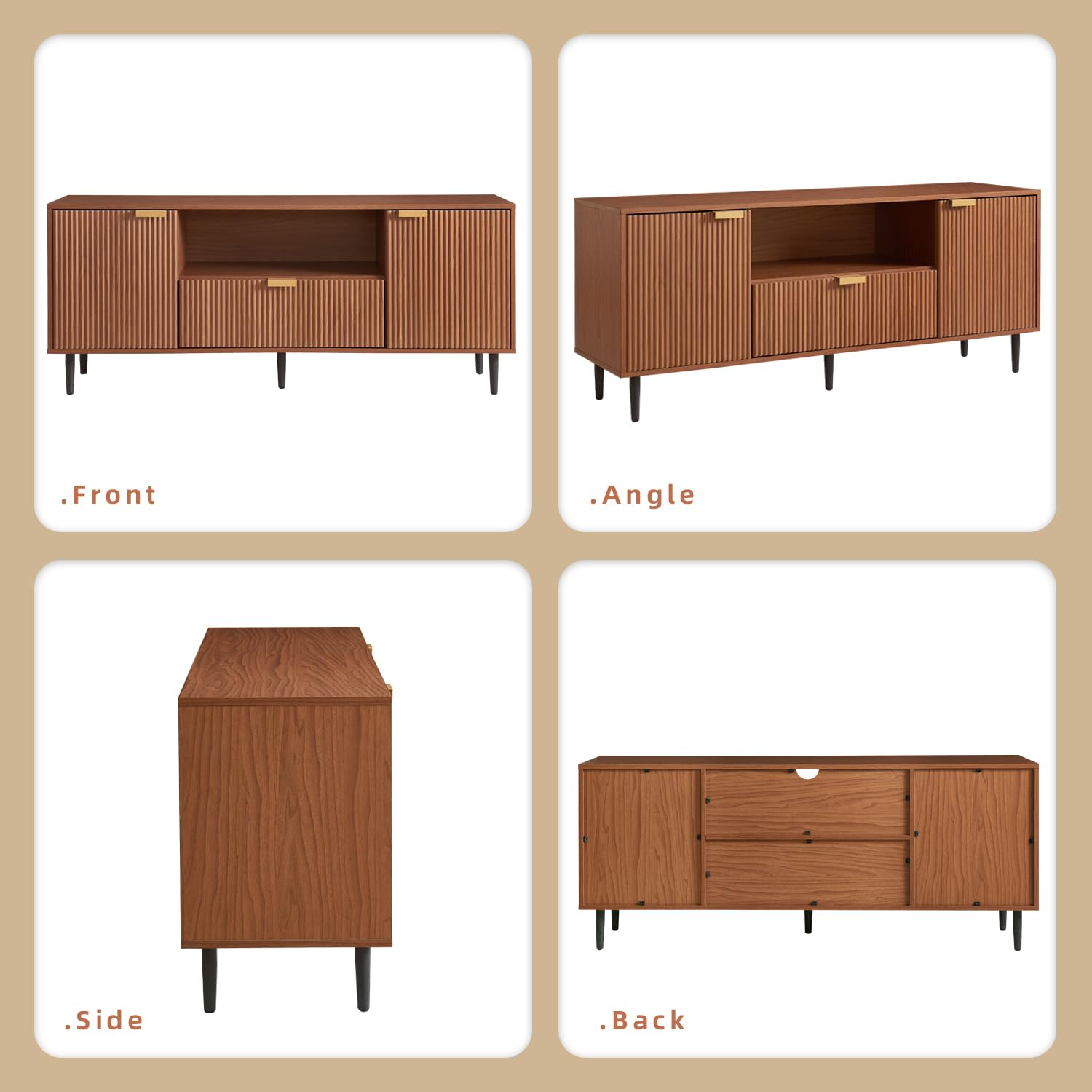 - Sleek Design & Durable Build: Measuring 58"W*15.6"D*24"H, this TV console flaunts a stylish and modern design that seamlessly complements any interior décor, be it minimalist or eclectic. Crafted from engineered wood and metal, the Oak TV stand is built tough. The robust construction offers a stable base for your up-to-65" television, ensuring durability and reliability